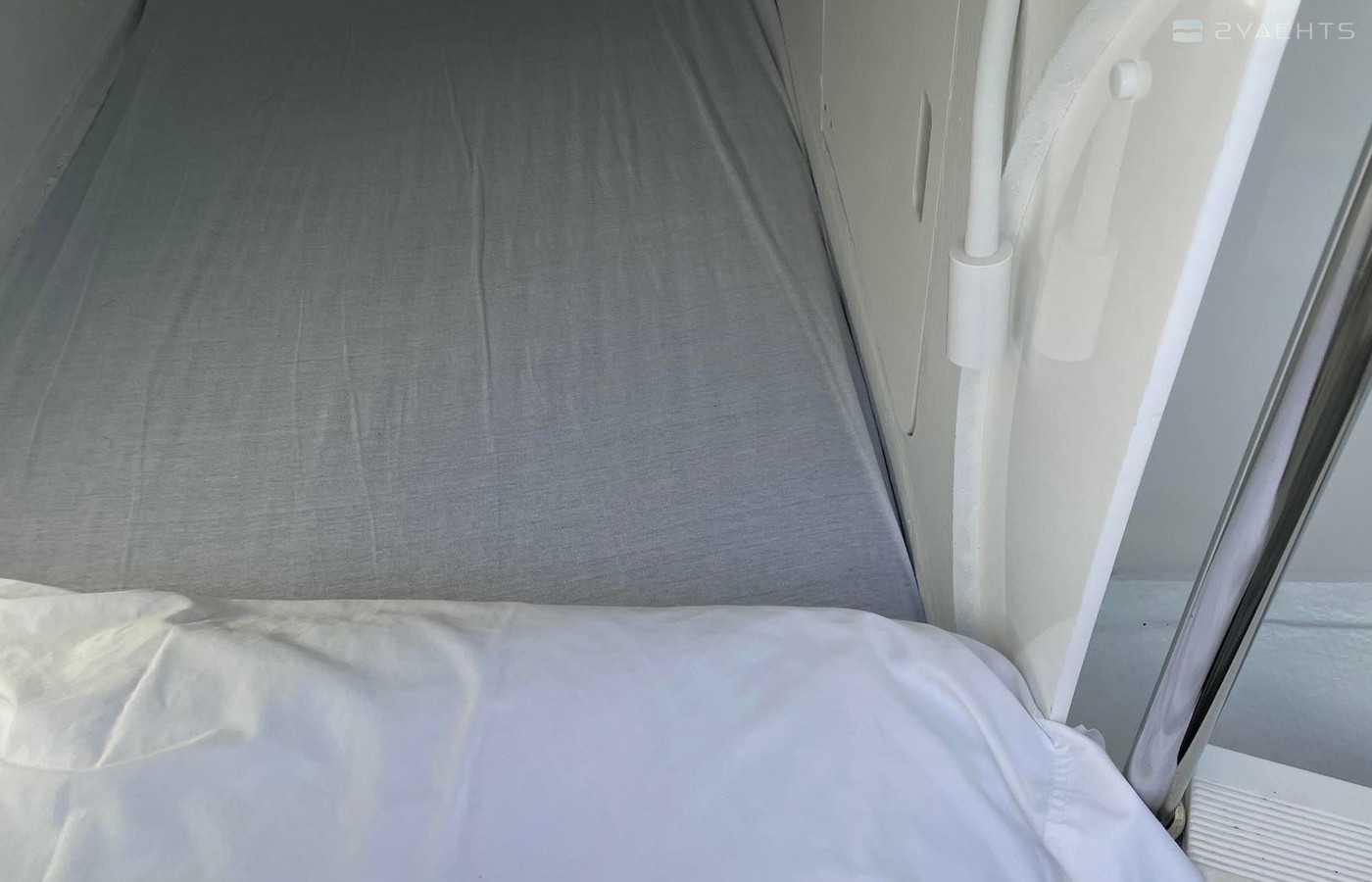 Boat equipment features classical mainsail, electric winches, generator, bbq, bimini and outside gps plotter. It also boasts a heating, air conditioning, an audio system, outside speakers and flybridge. The fully-equipped galley includes a microwave, freezer, oven, cooker and sink.