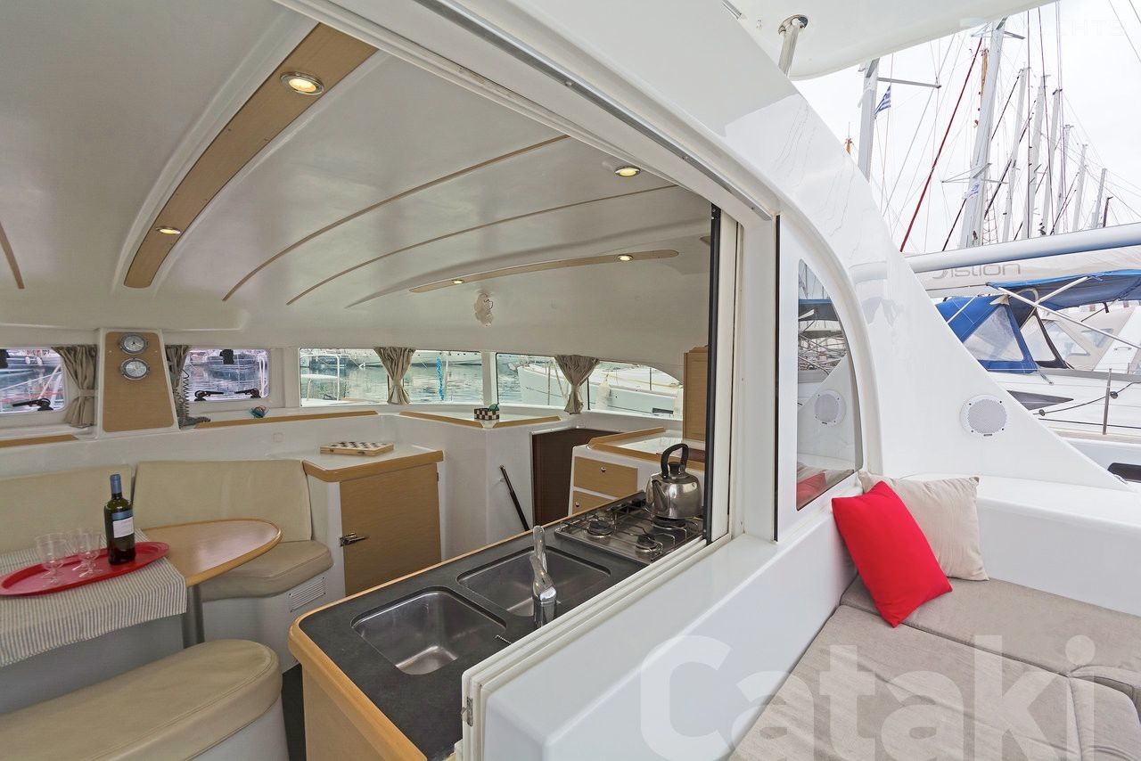 6-cabin catamaran Lagoon 380 S2 - Cataki was built in 2015, and it is docked in Marina Alimos, Greece.