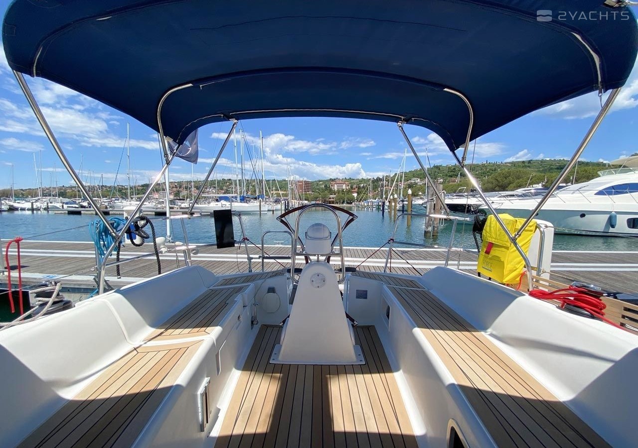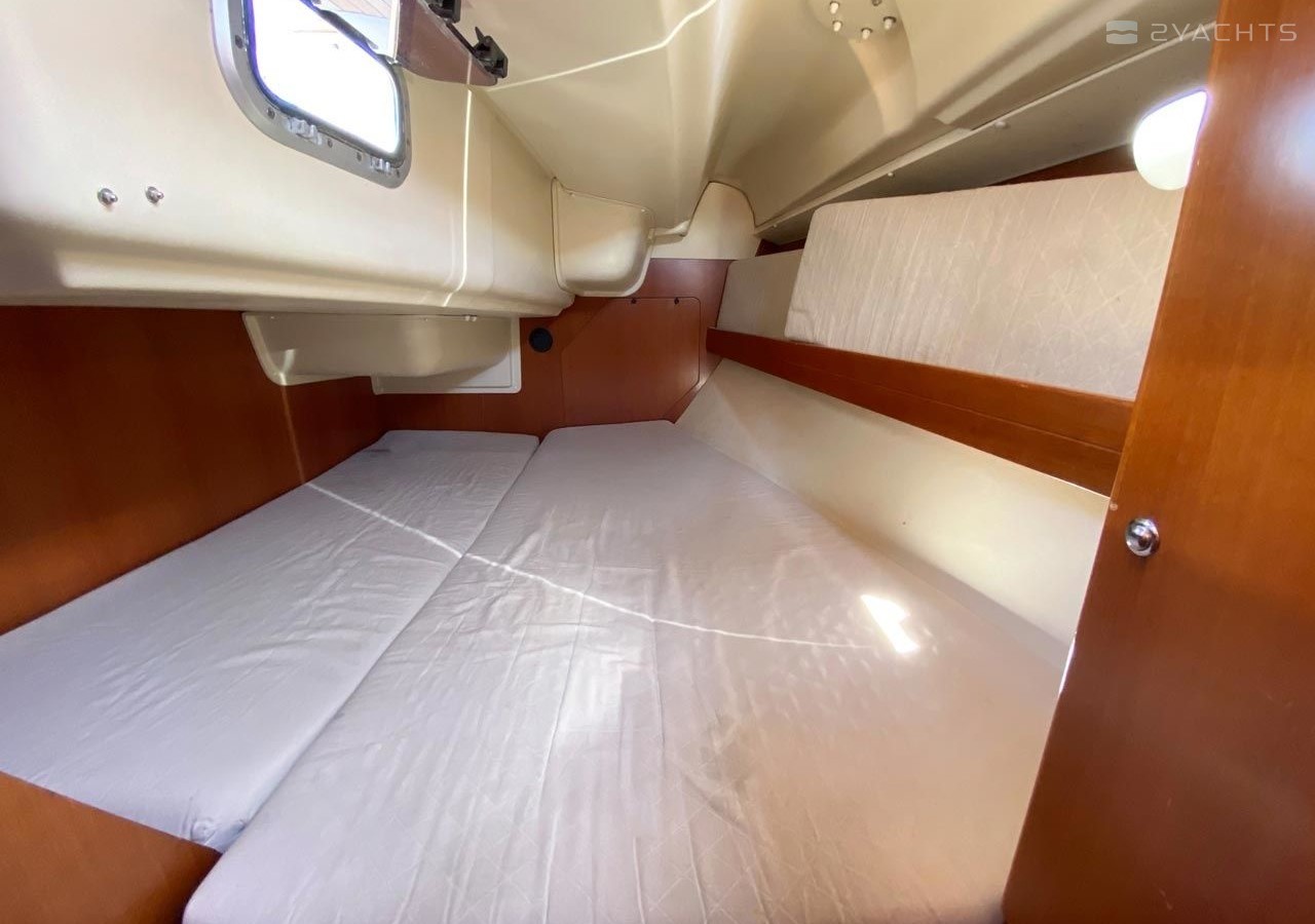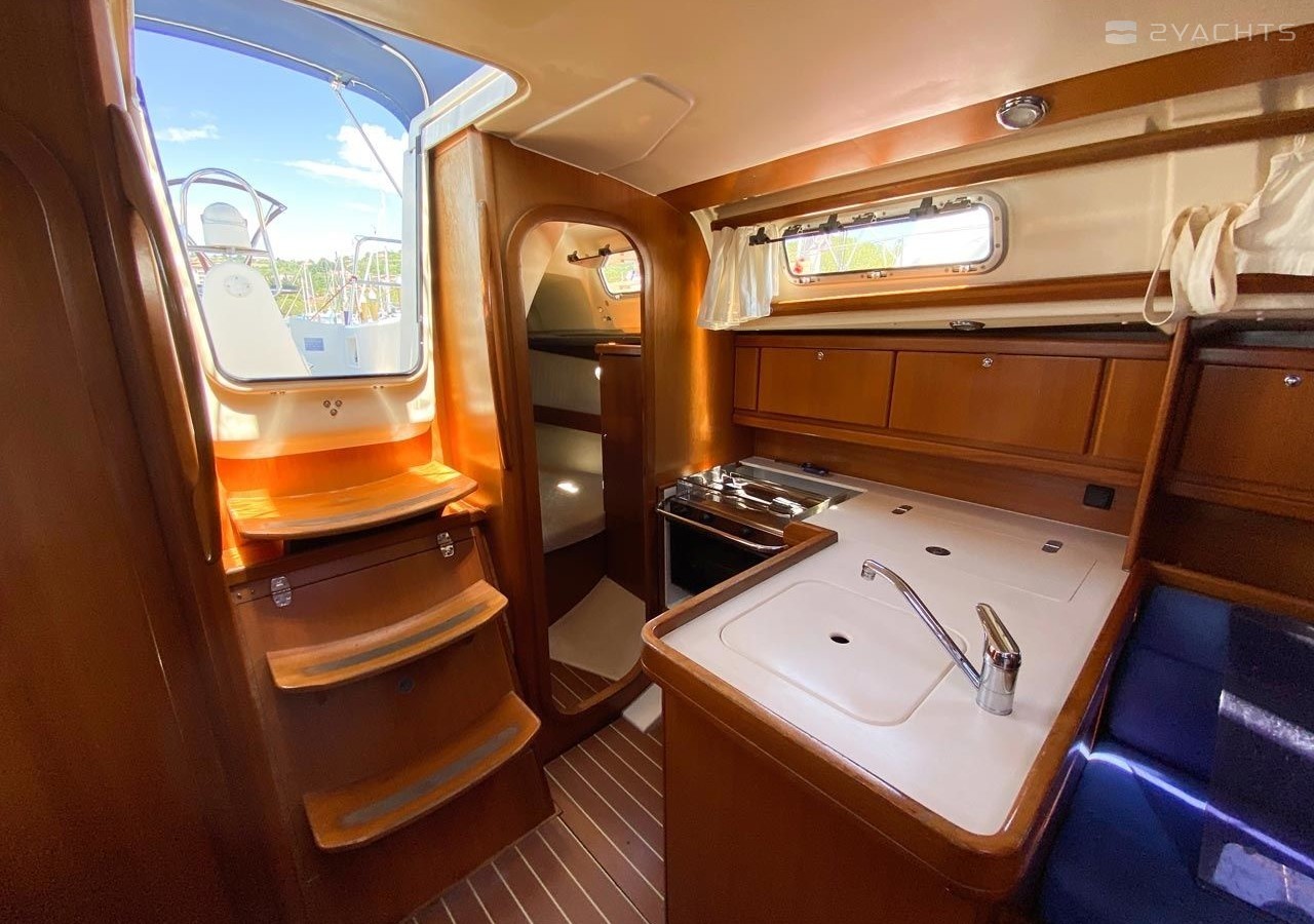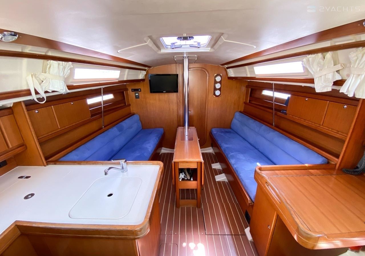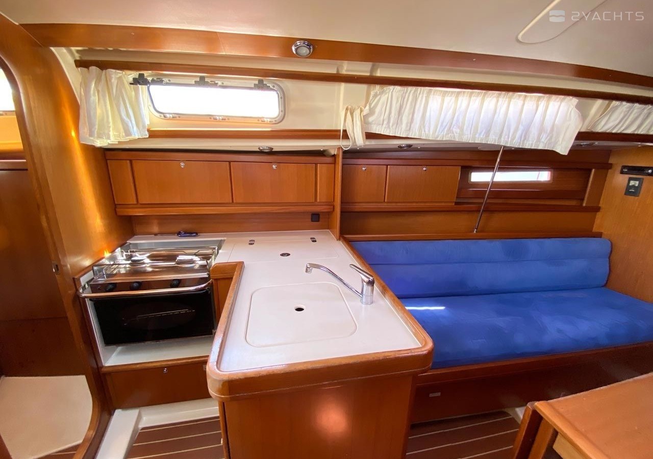Boat equipment features classical mainsail, salon gps plotter and bimini. It also boasts a heating, an audio system, outside speakers and inside speakers. The fully-equipped galley includes an oven, cooker, sink and kitchen utensils.