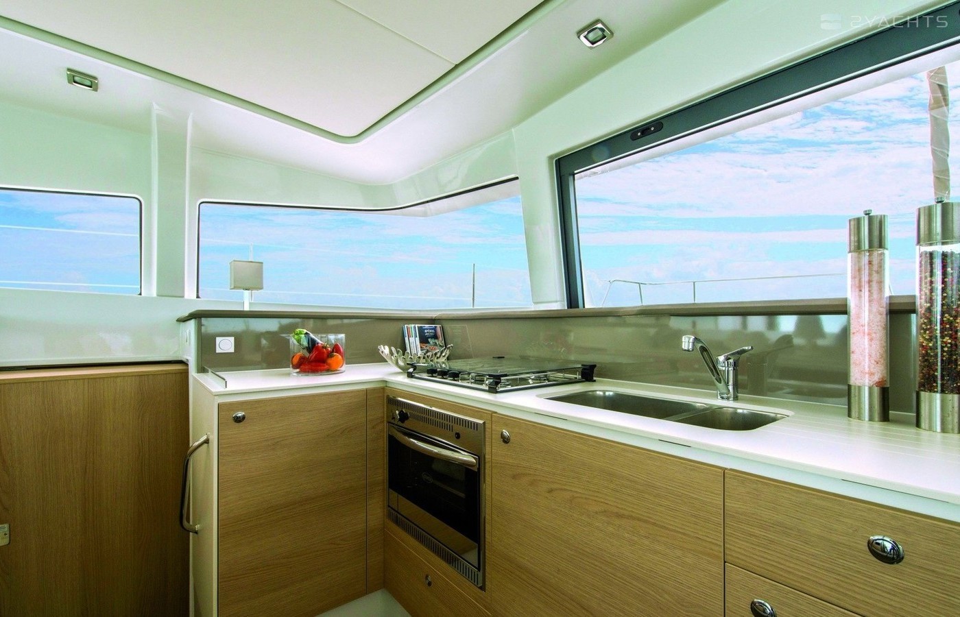 Boat equipment features classical mainsail, electric winches, solar panels, generator, salon gps plotter and bimini. It also boasts a heating, air conditioning, an audio system, outside speakers and inside speakers. The fully-equipped galley includes a microwave, freezer, oven, cooker and sink.