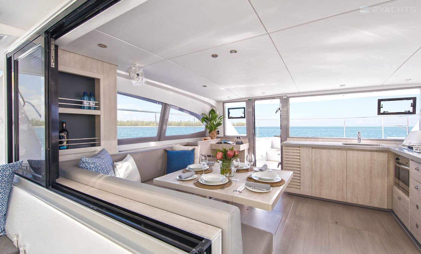Boat equipment features solar panels, bbq, bimini and outside gps plotter. It also boasts a flat screen tv, heating, air conditioning, an audio system and outside speakers. The fully-equipped galley includes a microwave, oven, cooker, sink and kitchen utensils.