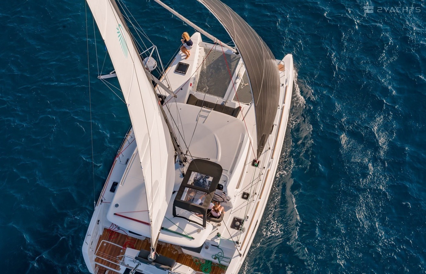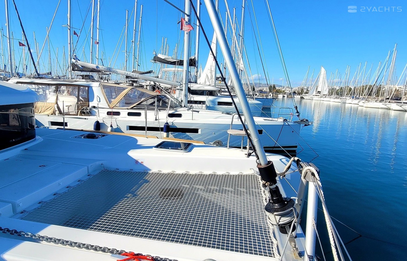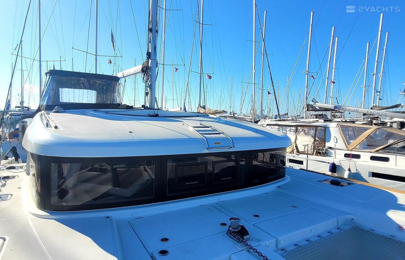 This catamaran is operated by the charter company Athenian Yachts.
