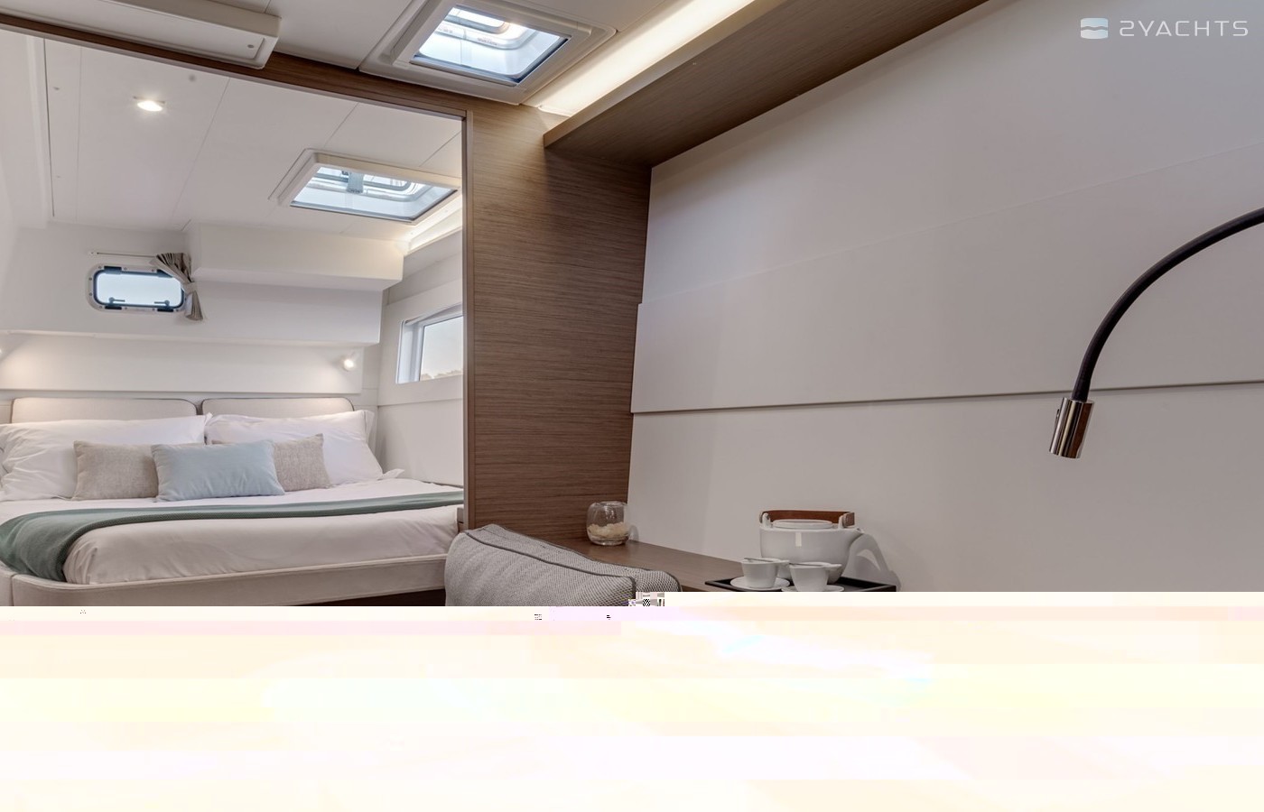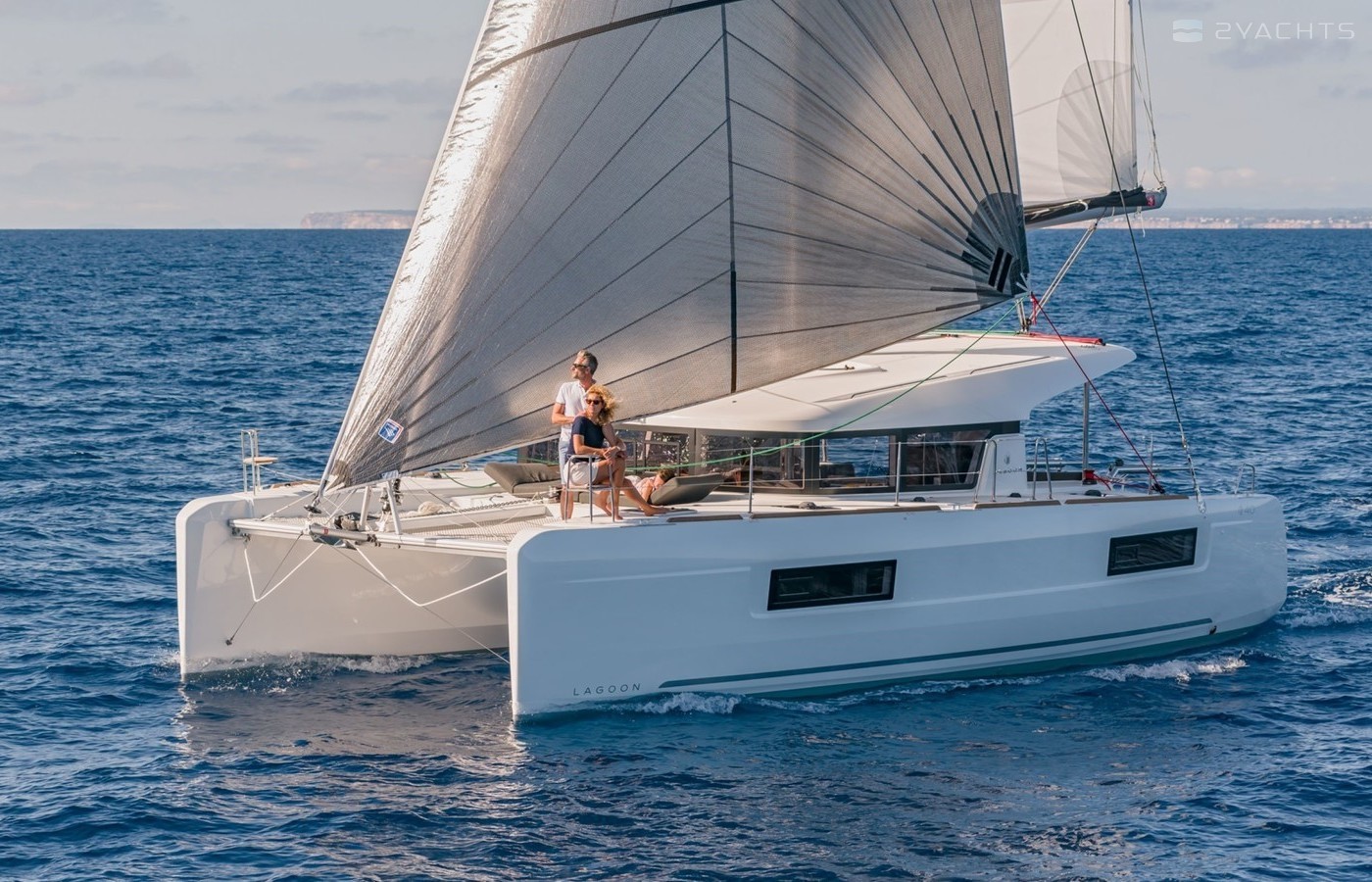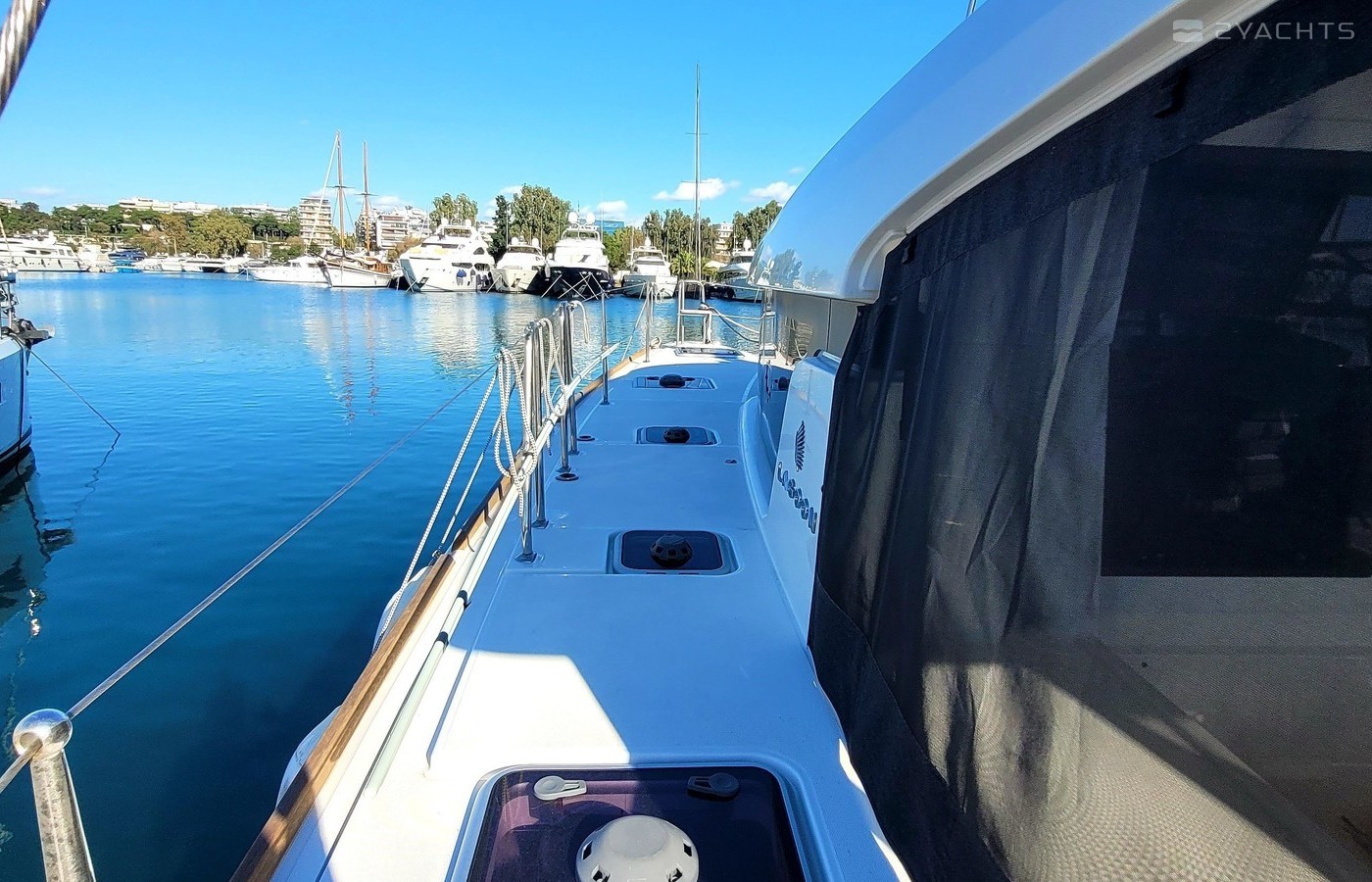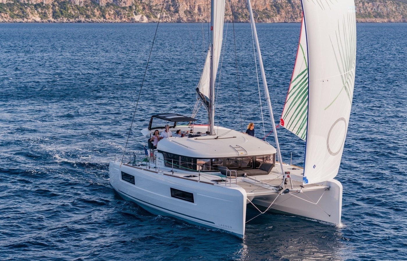 This catamaran is operated by the charter company Athenian Yachts.
