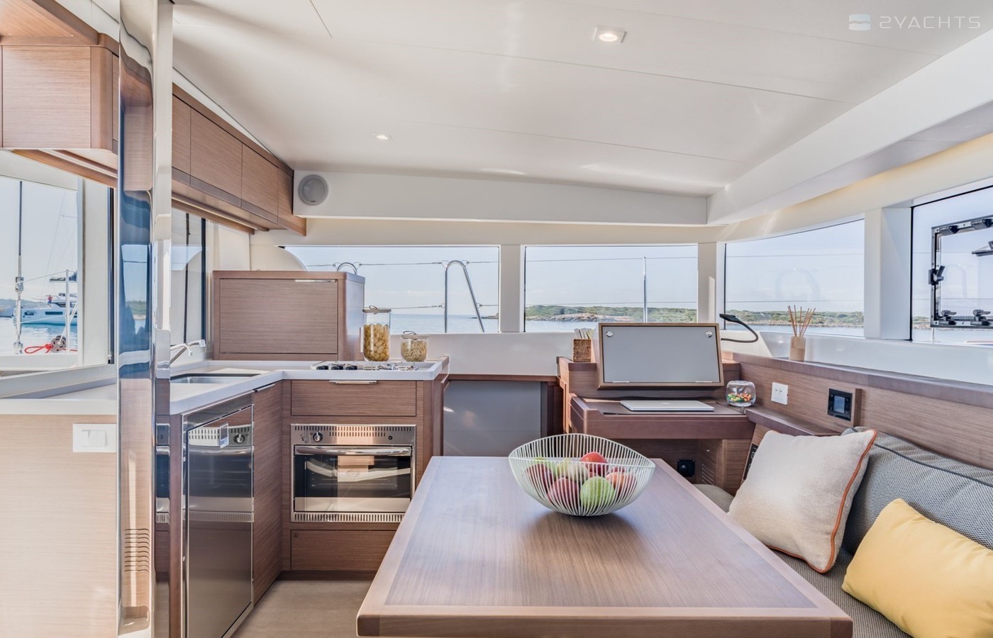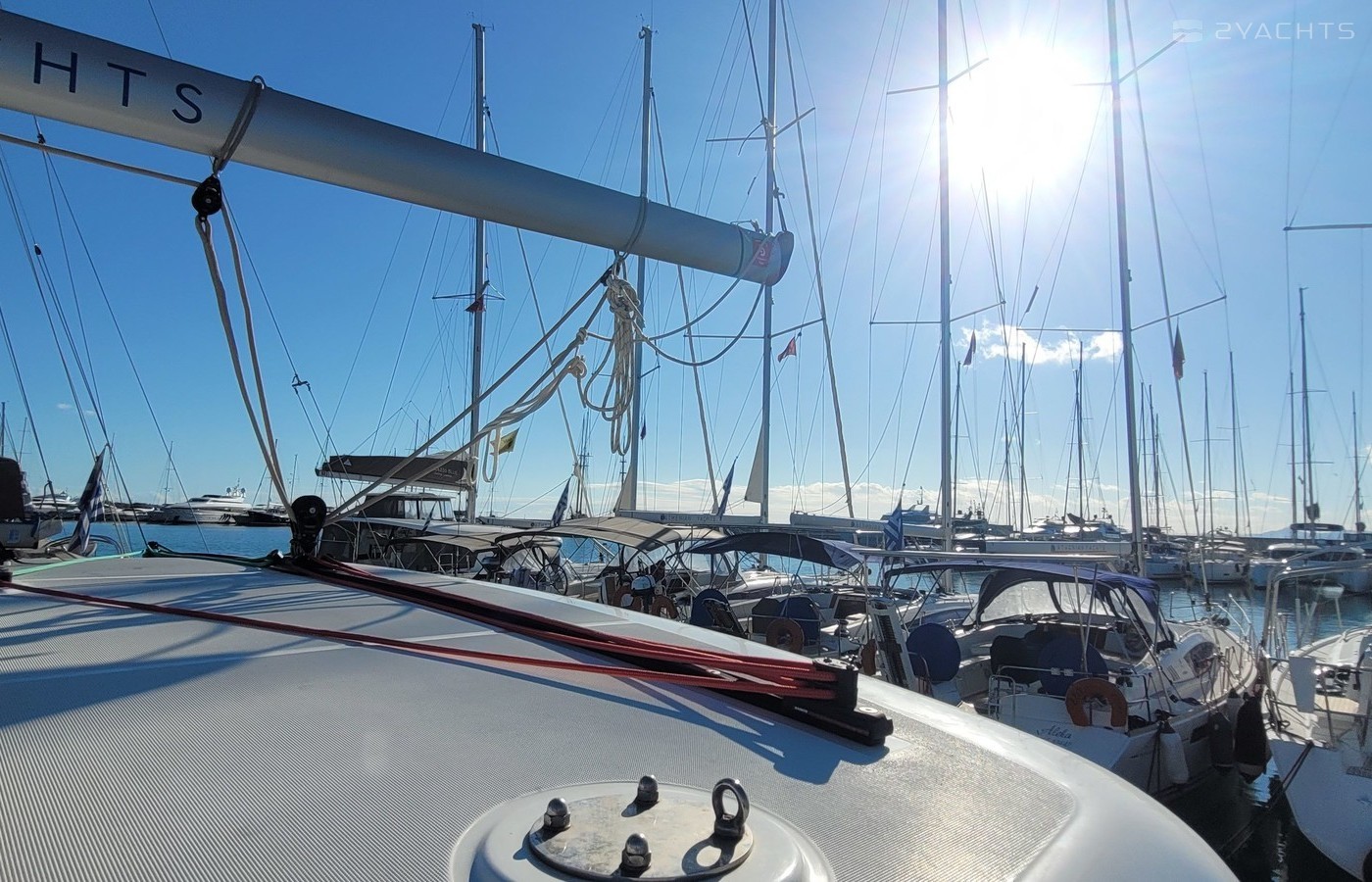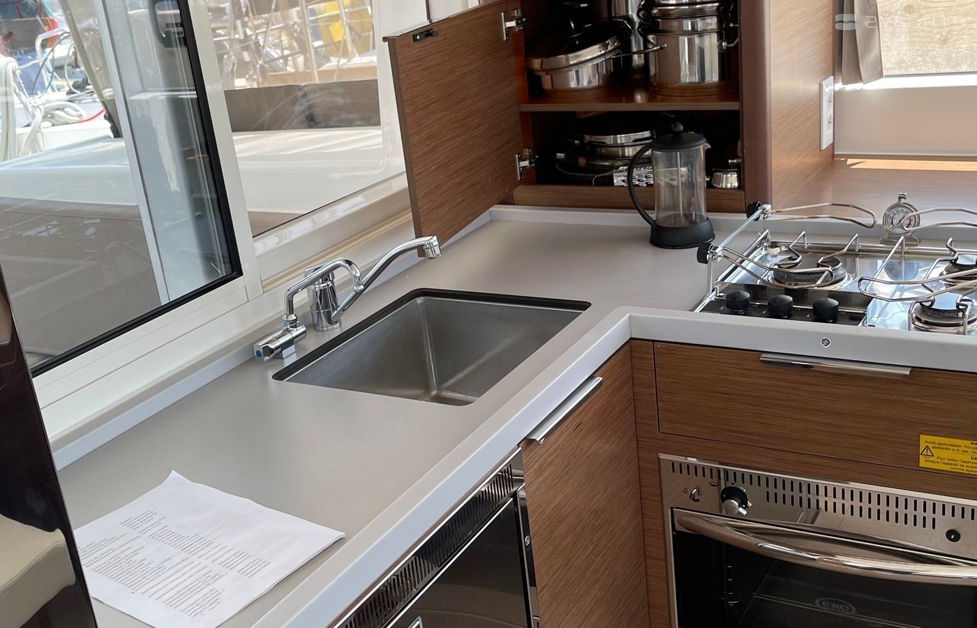 Boat equipment features classical mainsail, electric winches, solar panels, generator, bimini and outside gps plotter. It also boasts a heating, air conditioning, an audio system, outside speakers and inside speakers. The fully-equipped galley includes a freezer, oven, cooker, sink and kitchen utensils.