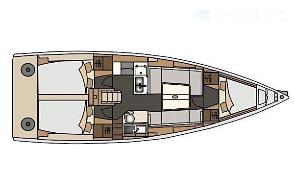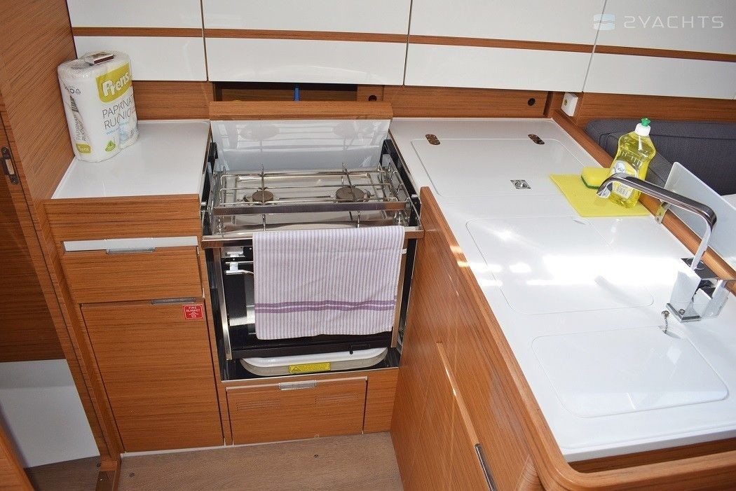 Boat equipment features classical mainsail, electric winches, bimini and outside gps plotter. It also boasts a heating, an audio system, outside speakers and inside speakers. The fully-equipped galley includes an oven, cooker, sink and kitchen utensils.