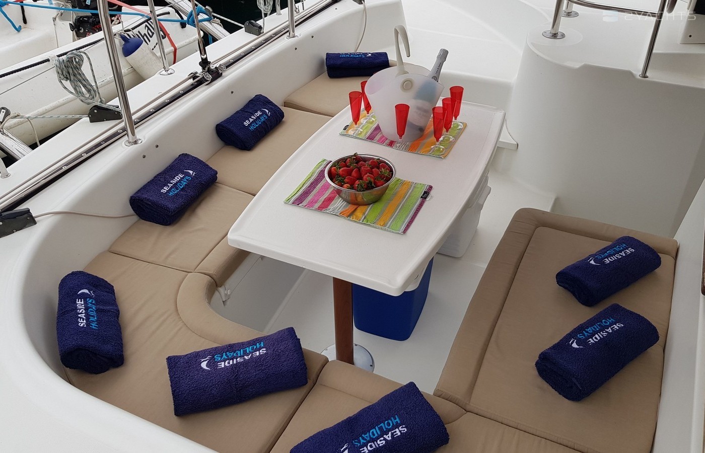 Boat equipment features classical mainsail, bimini and outside gps plotter. It also boasts an an audio system and inside speakers. The fully-equipped galley includes an oven, cooker, sink and kitchen utensils.