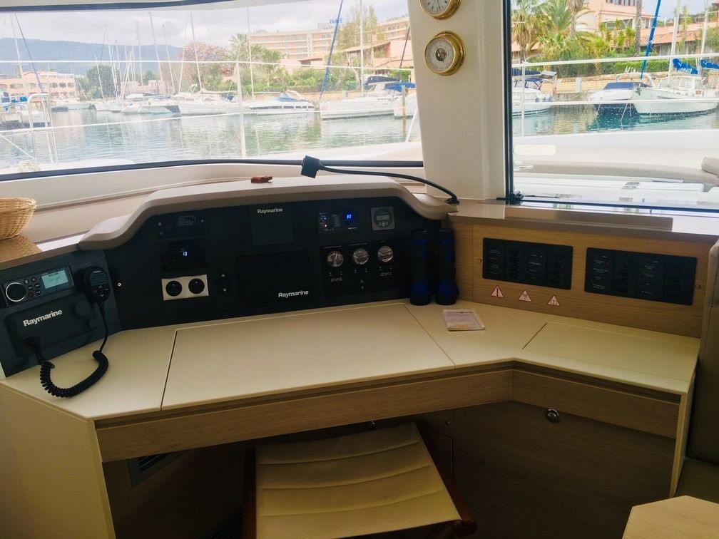 Boat equipment features classical mainsail, electric winches, solar panels, generator, bimini and outside gps plotter. It also boasts a heating, air conditioning, an audio system, outside speakers and flybridge. The fully-equipped galley includes a microwave, ice maker, freezer, oven and cooker.