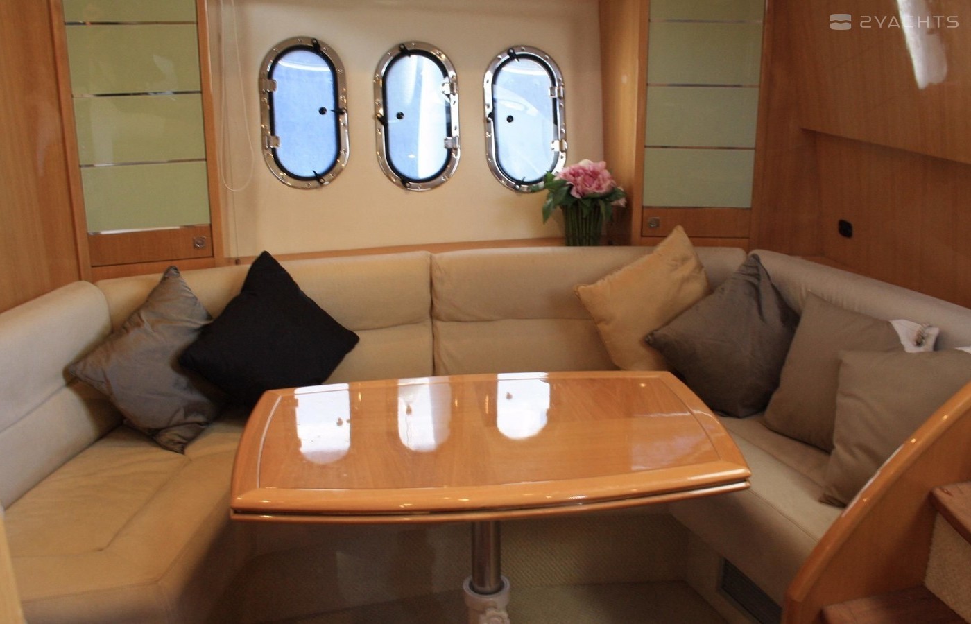 Boat equipment features radar, generator, bimini and bow thruster. It also boasts a flat screen tv, heating, air conditioning, an audio system and outside speakers. The fully-equipped galley includes a cooker, sink and kitchen utensils.