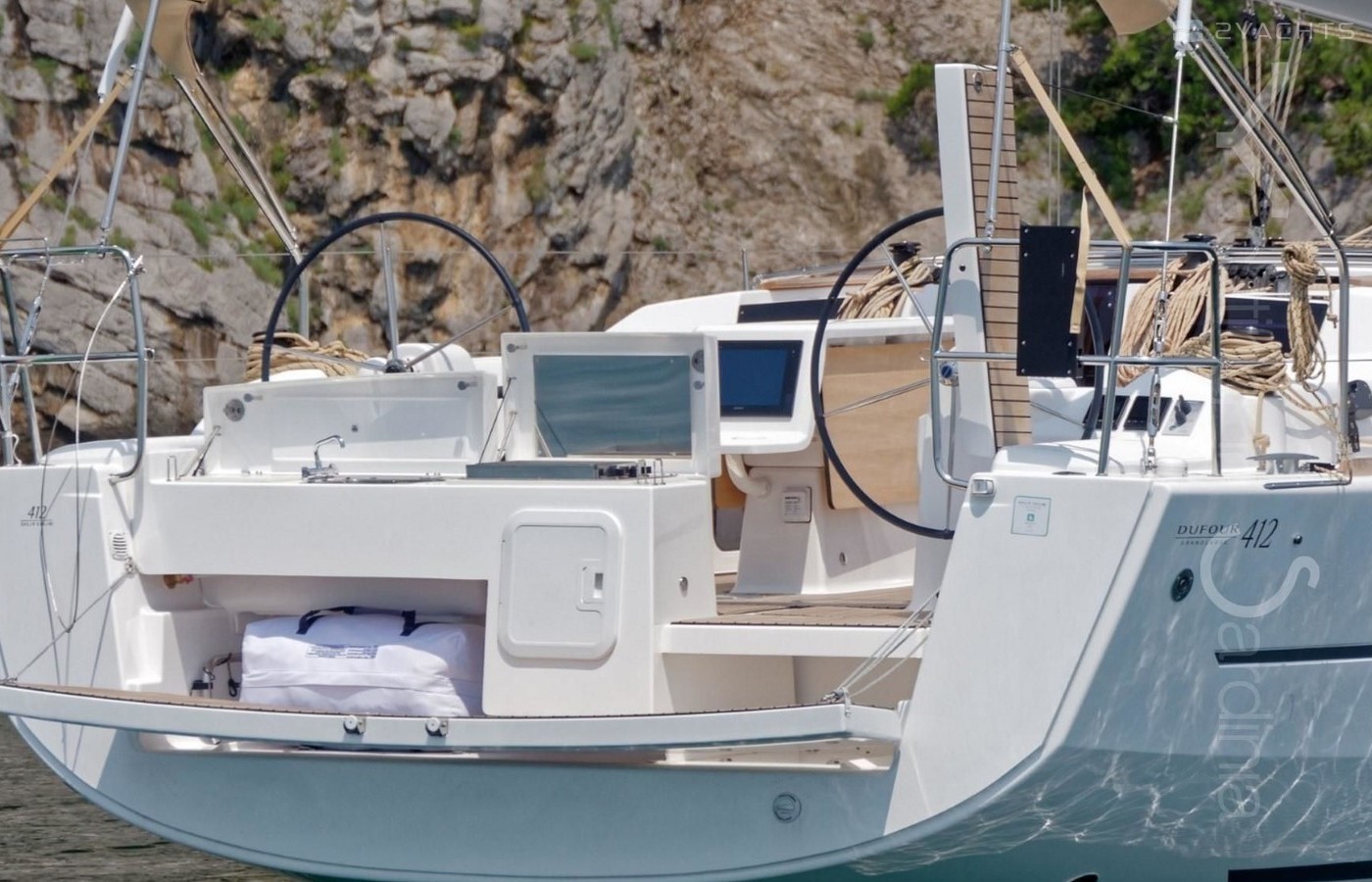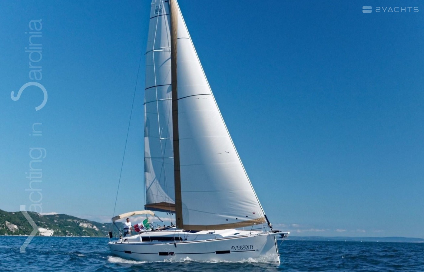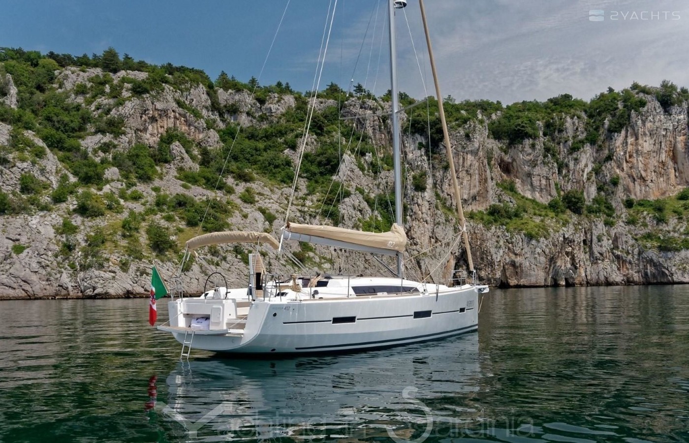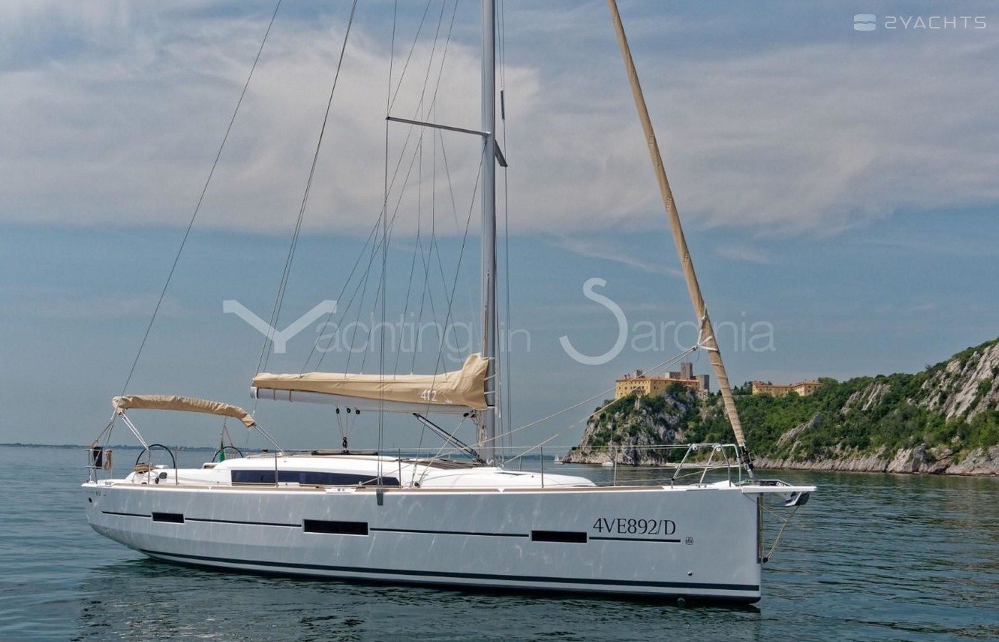 3-cabin sailing yacht Dufour 412 - Pamoja was built in 2021, and it is docked in Punta Nuraghe Pier, Italy.