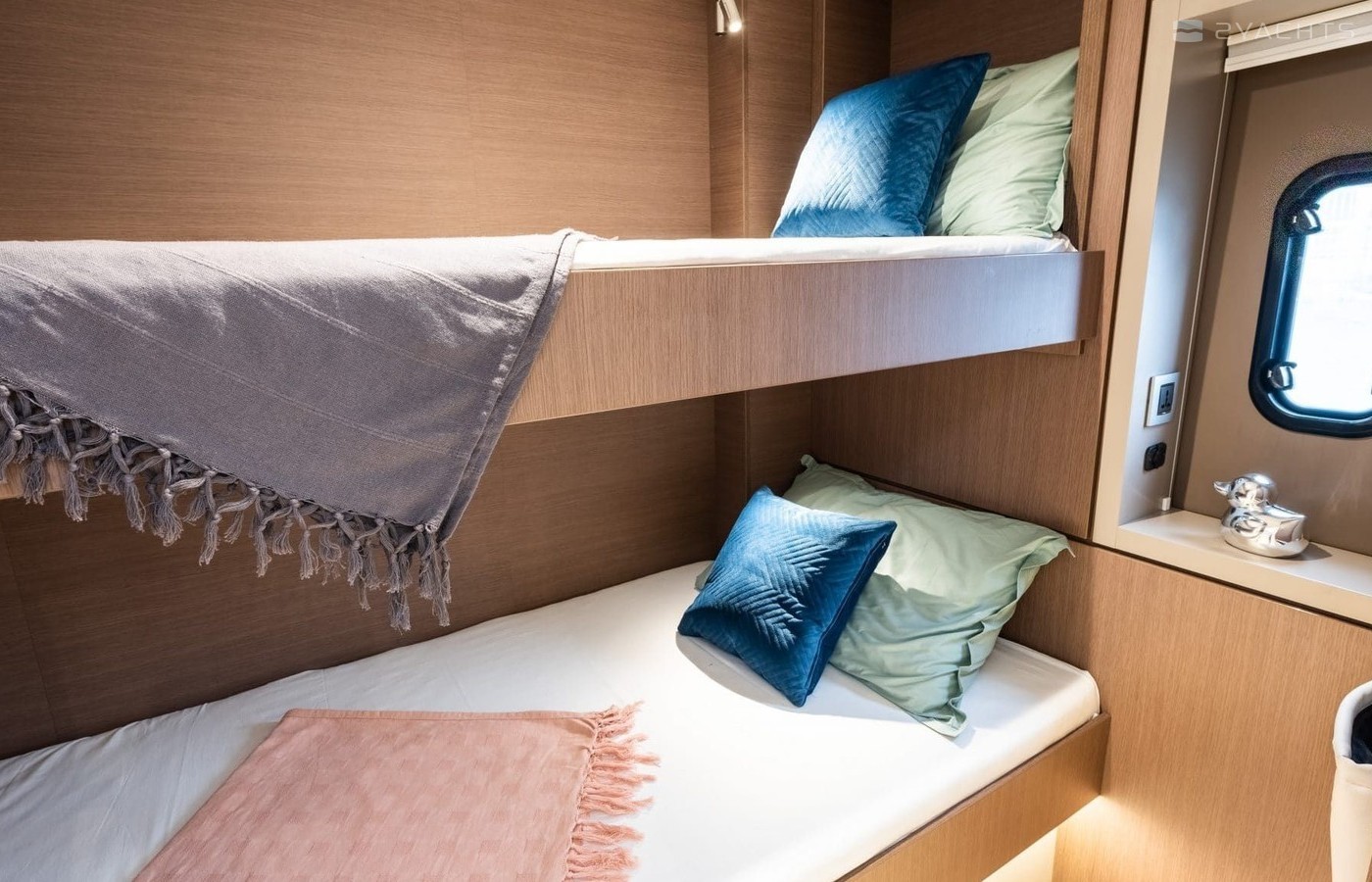Boat equipment features classical mainsail, electric winches, solar panels, generator, bimini and outside gps plotter. It also boasts a heating, air conditioning, an audio system, outside speakers and flybridge. The fully-equipped galley includes a microwave, ice maker, freezer, coffee machine and oven.