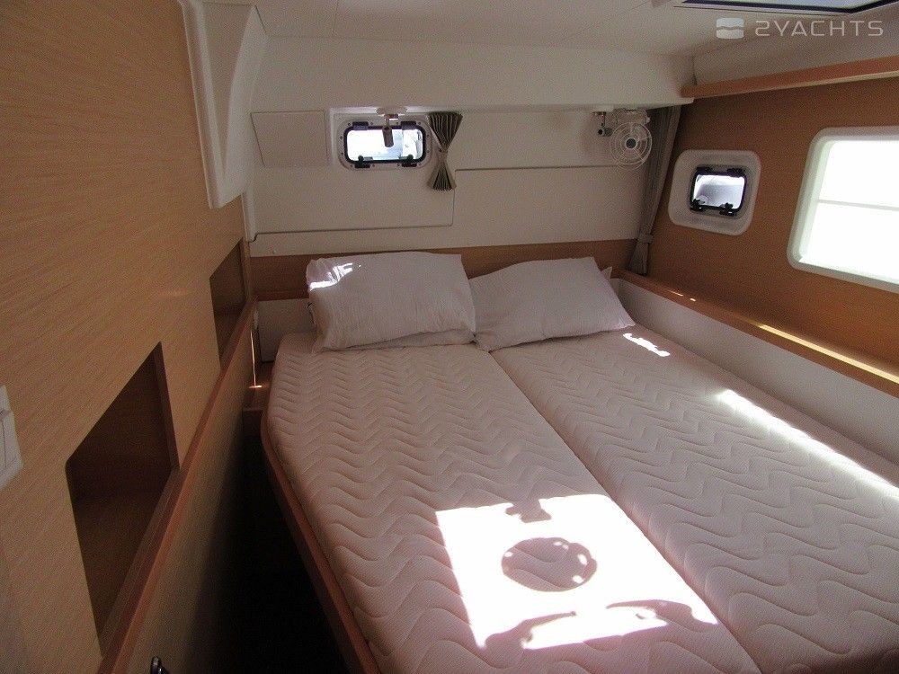 Boat equipment features classical mainsail, electric winches, salon gps plotter, bimini and bathing platform. It also boasts a heating, an audio system, outside speakers and inside speakers. The fully-equipped galley includes a freezer, oven, cooker, sink and kitchen utensils.