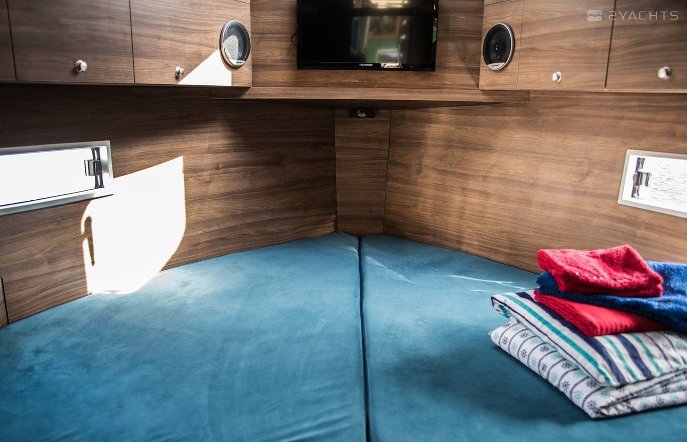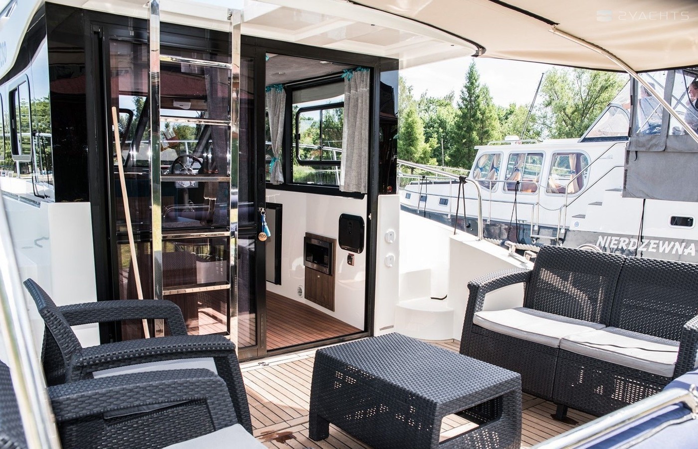 Boat equipment features bimini and bow thruster. It also boasts a flat screen tv, heating, an audio system, outside speakers and inside speakers. The fully-equipped galley includes a microwave, cooker, sink and kitchen utensils.