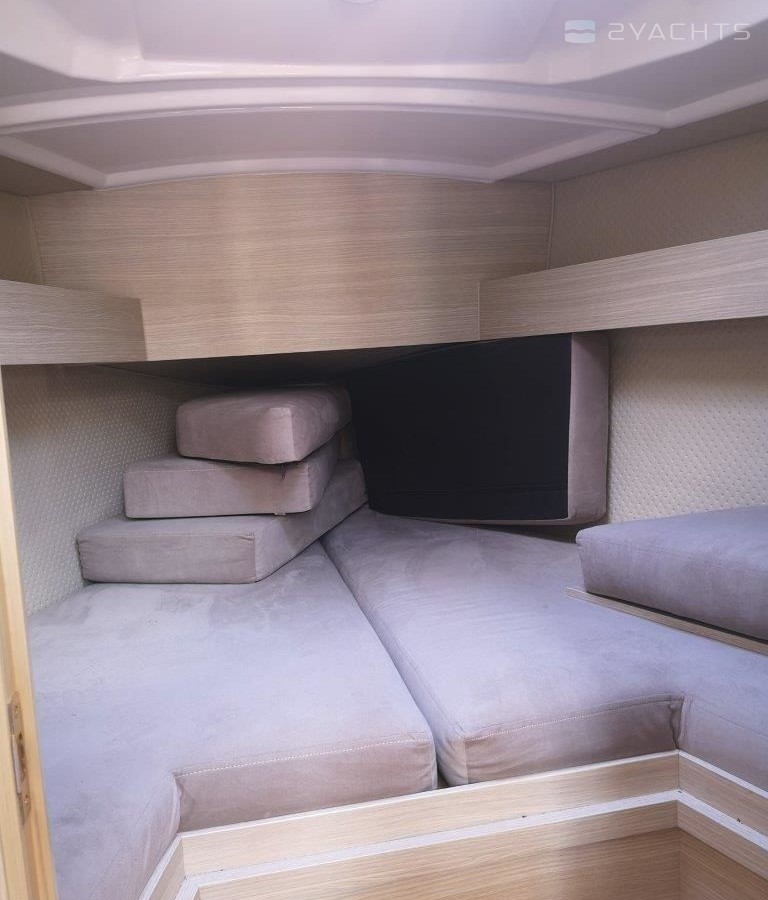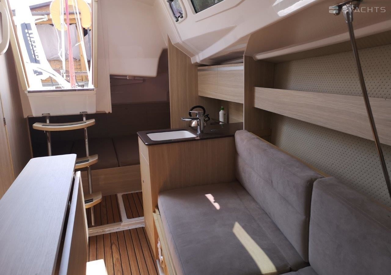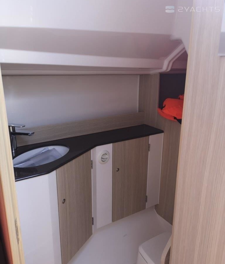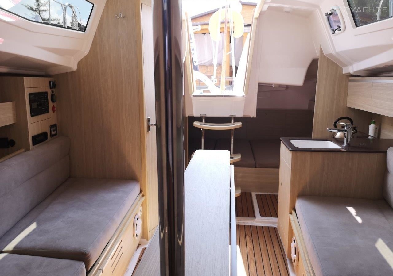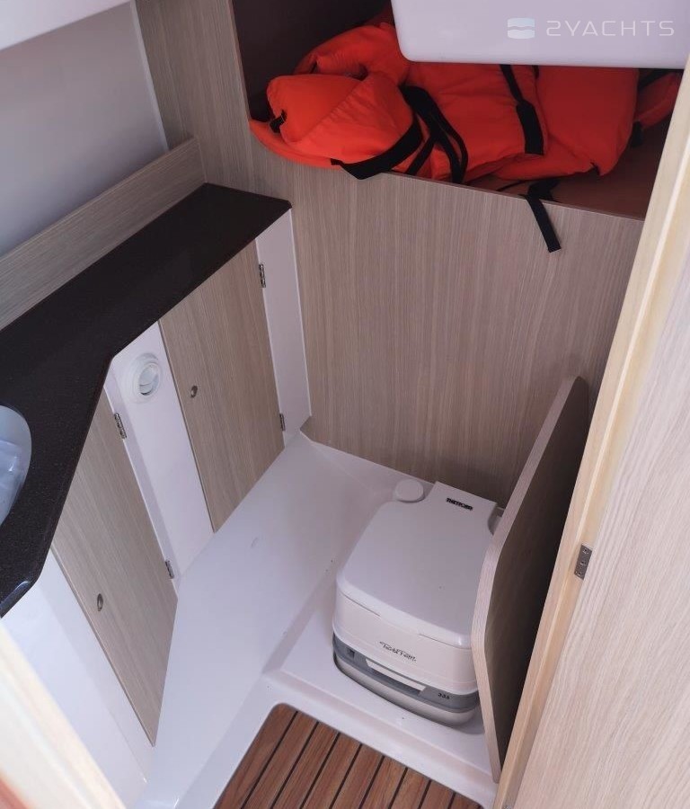 Boat equipment features classical mainsail. It also boasts a heating, an audio system and inside speakers. The fully-equipped galley includes a cooker, sink and kitchen utensils.