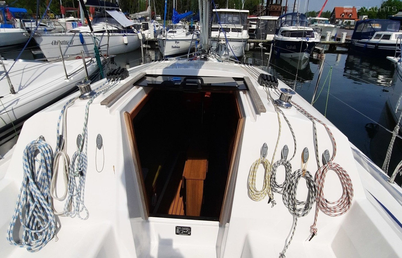 Boat equipment features classical mainsail. It also boasts a heating, an audio system and inside speakers. The fully-equipped galley includes a cooker, sink and kitchen utensils.