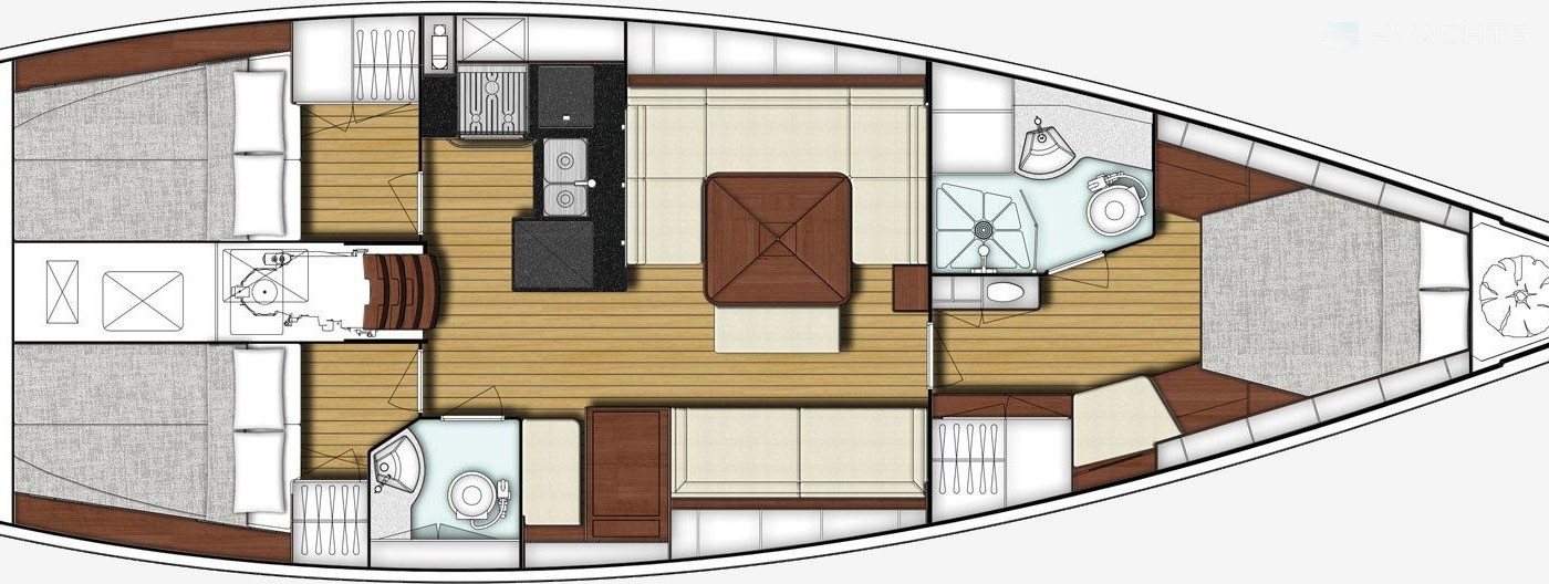 Ariadne can accommodate up to 8 people in 3 double cabins and a saloon with 2 extra beds. Pillows and blankets are included in the price.