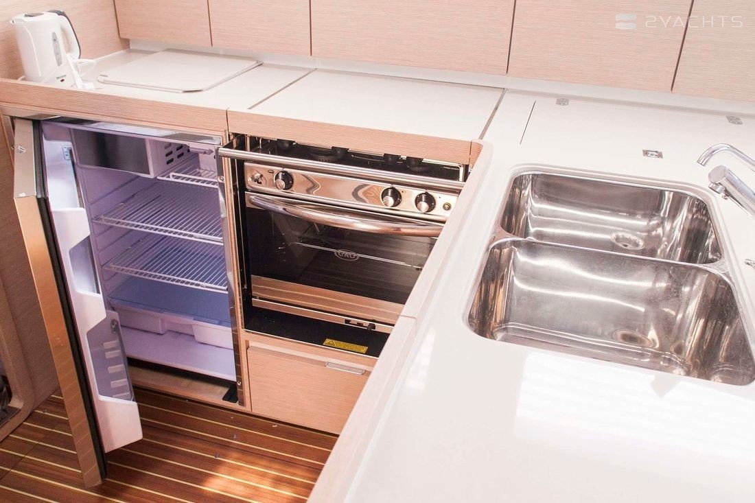 Boat equipment features rolling mainsail, bimini and bow thruster. It also boasts a flat screen tv, heating, an audio system and outside speakers. The fully-equipped galley includes a freezer, oven, cooker, sink and kitchen utensils.
