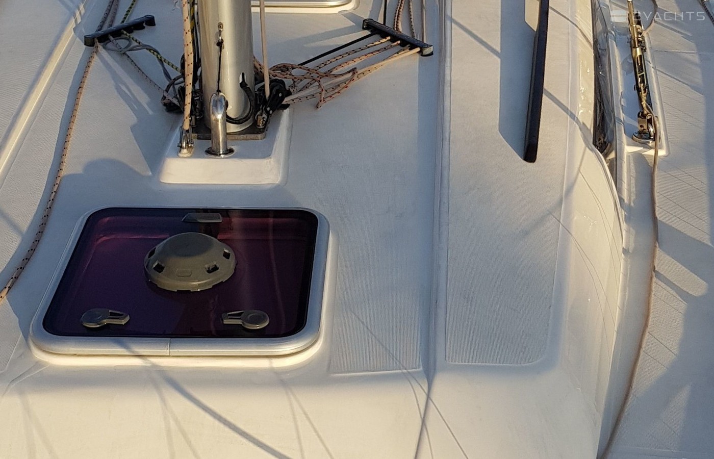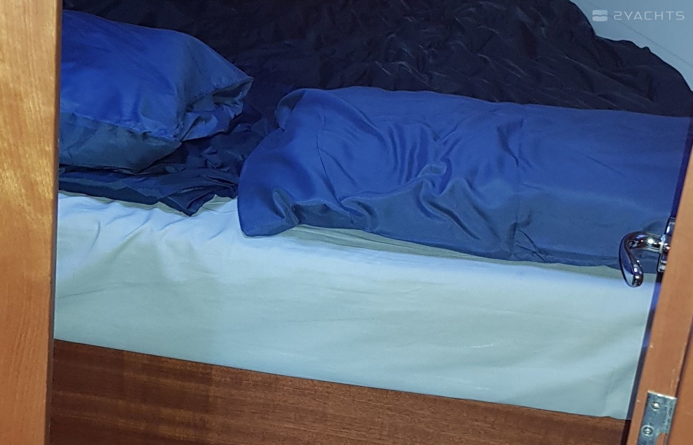 Boat equipment features classical mainsail, electric winches, salon gps plotter, bimini and outside gps plotter. It also boasts a flat screen tv, heating, an audio system, outside speakers and kayak. The fully-equipped galley includes a microwave, coffee machine, cooker, sink and kitchen utensils.