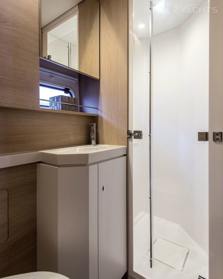 Boat equipment features classical mainsail, electric winches, solar panels, radar, generator and bimini. It also boasts a heating, air conditioning, an audio system, outside speakers and flybridge. The fully-equipped galley includes a microwave, dishwasher, ice maker, freezer and coffee machine.