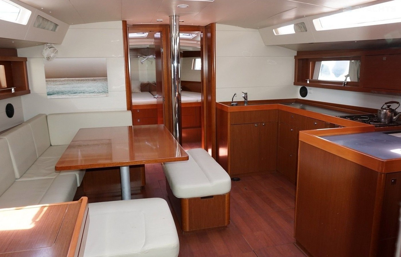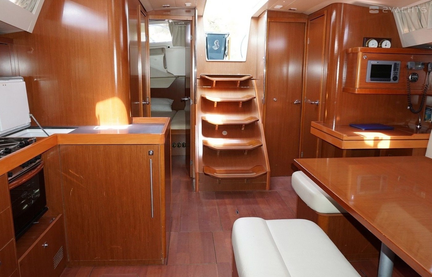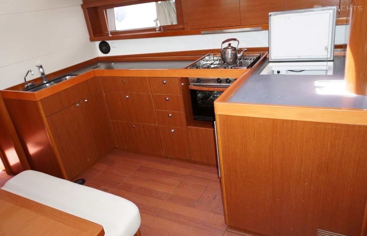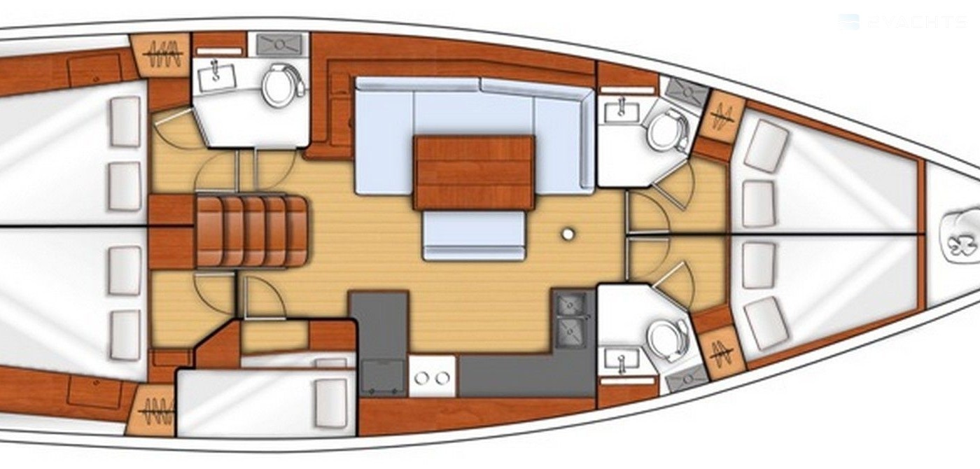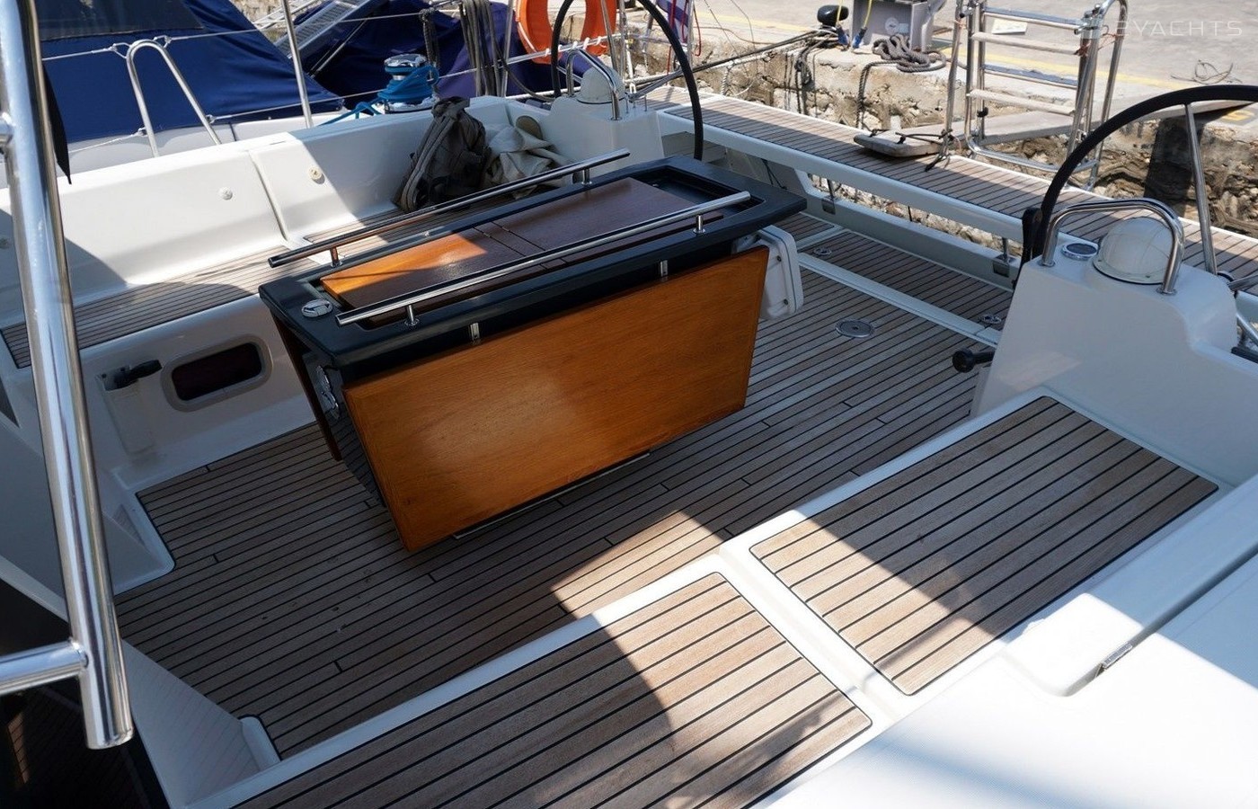 Boat equipment features classical mainsail, bimini and bow thruster. It also boasts an an audio system, outside speakers and inside speakers. The fully-equipped galley includes an oven, cooker, sink and kitchen utensils.