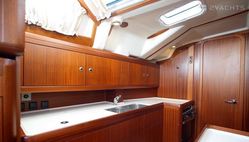 Boat equipment features rolling mainsail, radar, bimini and bow thruster. It also boasts a heating, an audio system and inside speakers. The fully-equipped galley includes a freezer, oven, cooker, sink and kitchen utensils.