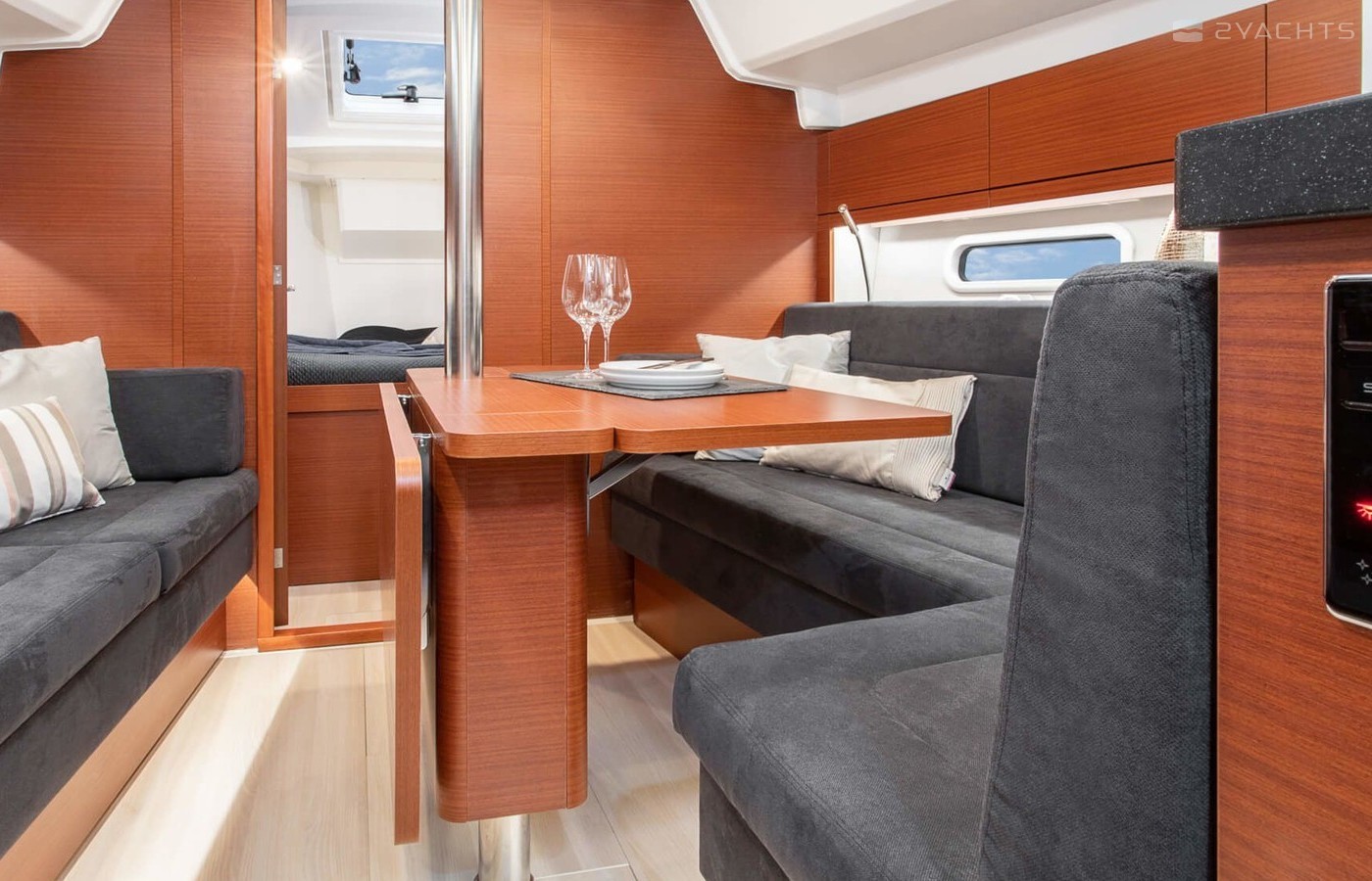 Mola 21-3 Flensburg can accommodate up to 8 people in 3 double cabins and a saloon with 2 extra beds. Pillows and blankets are included in the price.
