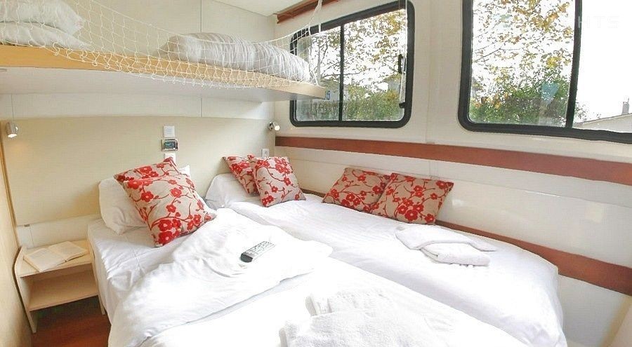 This houseboat is equipped with bbq, bimini and bow thruster. In chilly weather, guests will benefit from heating. an audio system, dvd player, flybridge and inside speakers are also available.