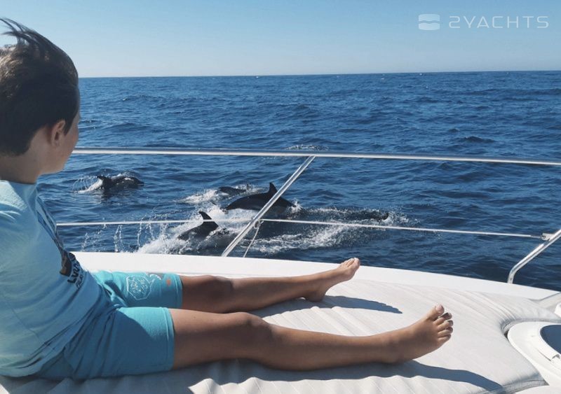 Boat equipment features bimini and outside gps plotter. It also boasts an an audio system, outside speakers, flybridge and inside speakers. The fully-equipped galley includes a microwave, ice maker, cooker, sink and kitchen utensils.