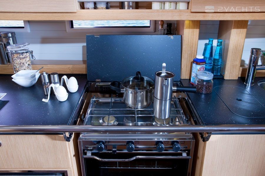 Boat equipment features classical mainsail, bimini and bow thruster. It also boasts an an audio system, outside speakers and inside speakers. The fully-equipped galley includes an oven, cooker, sink and kitchen utensils.