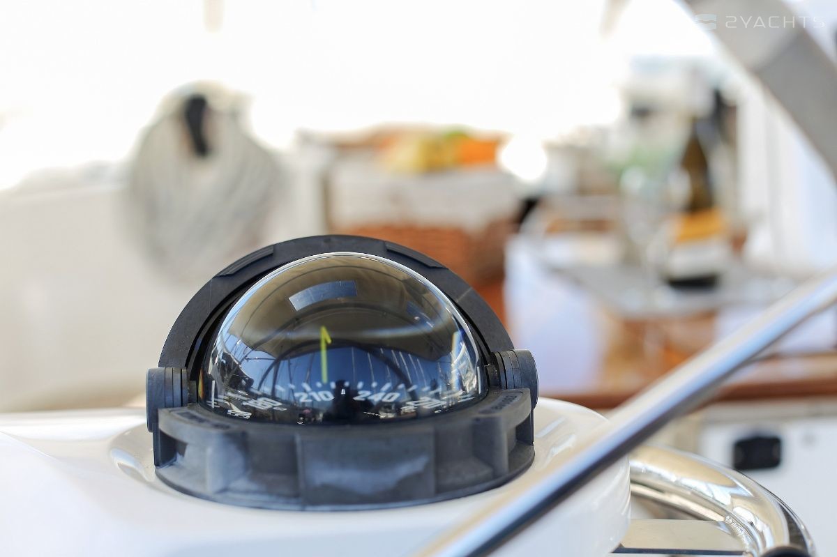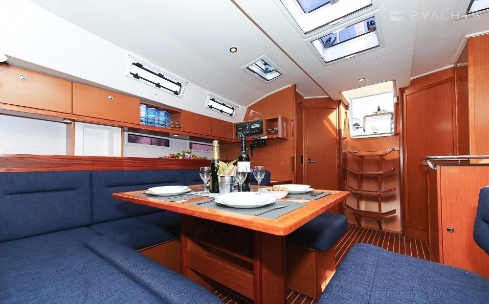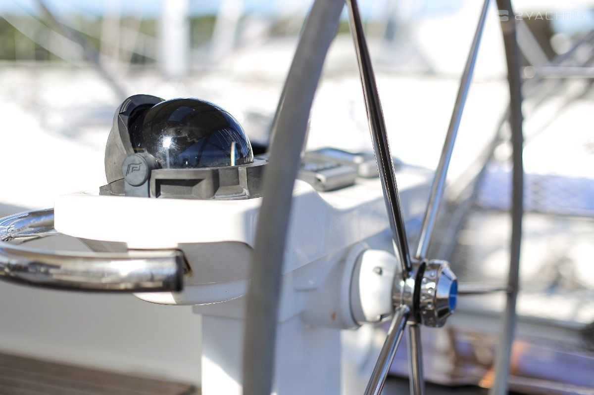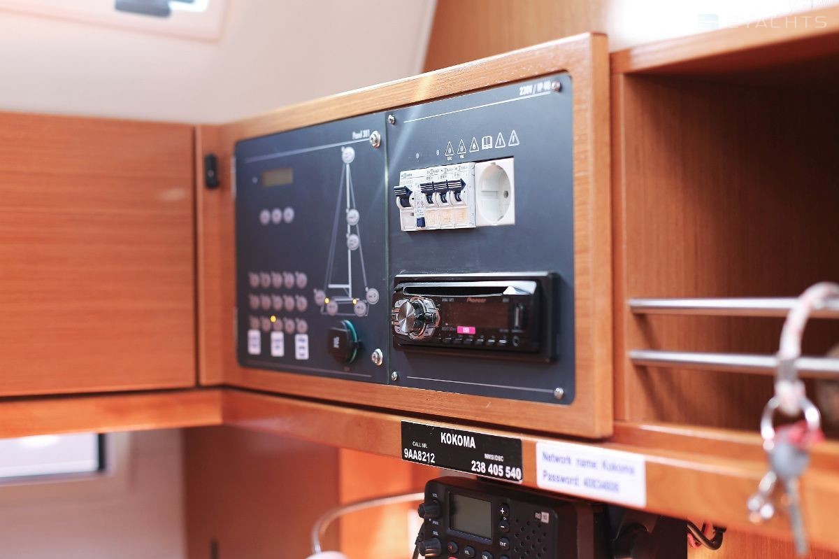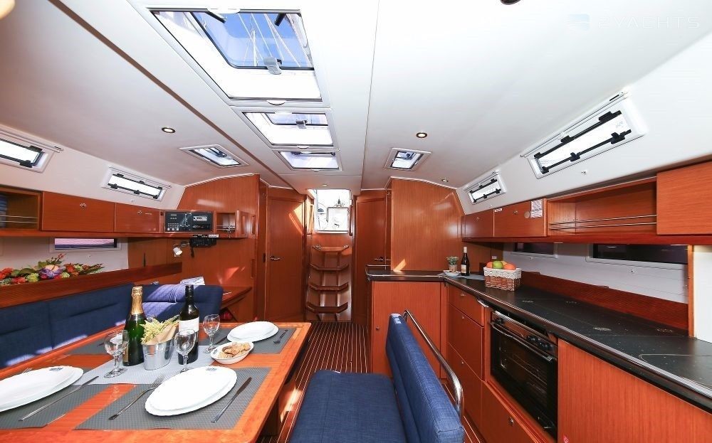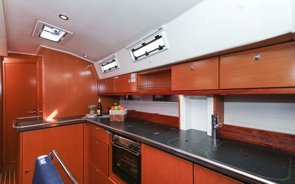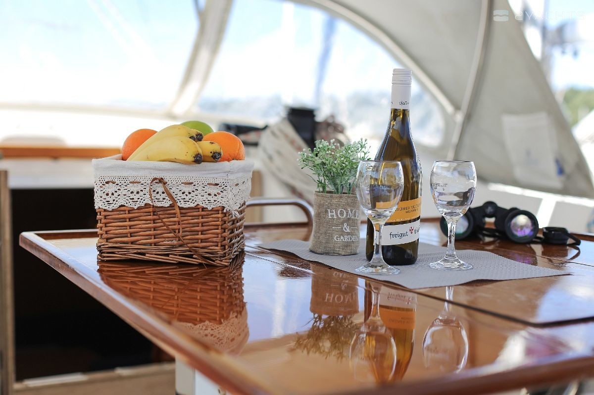 Boat equipment features rolling mainsail, solar panels, bimini and bow thruster. It also boasts a heating, an audio system and outside speakers. The fully-equipped galley includes an oven, cooker, sink and kitchen utensils.