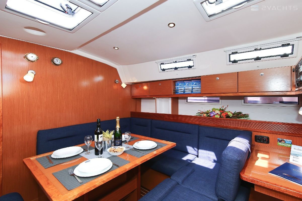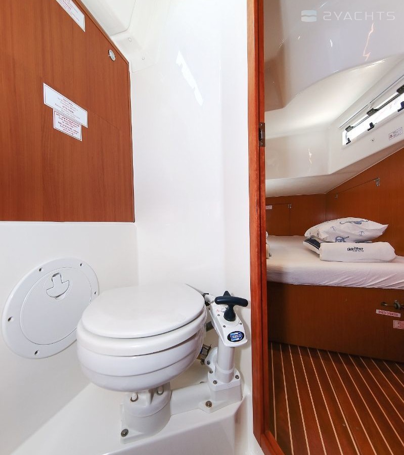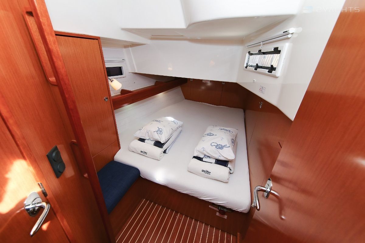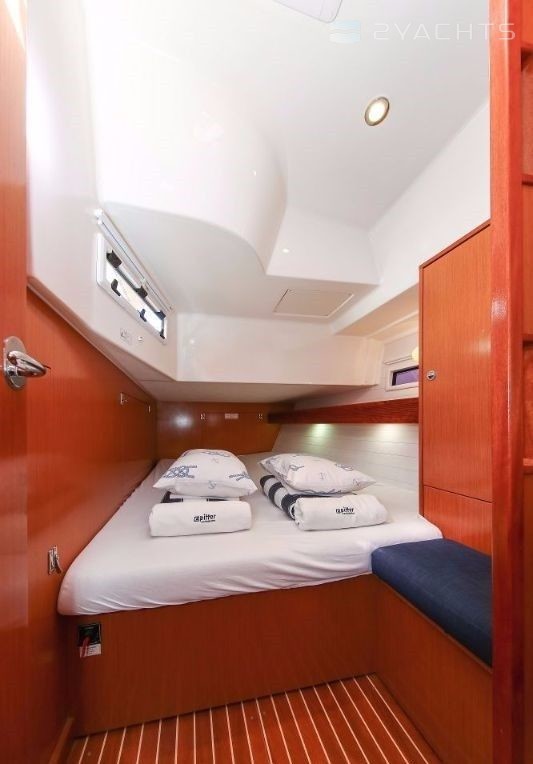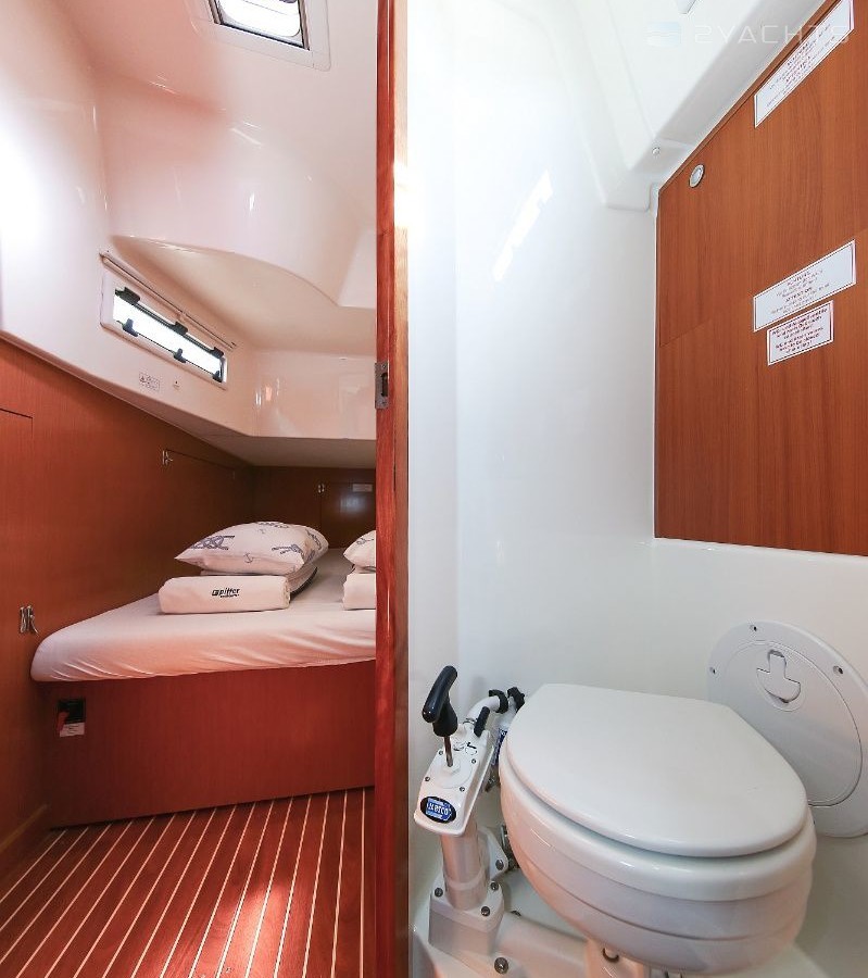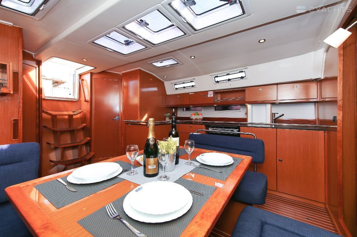 Boat equipment features rolling mainsail, solar panels, bimini and bow thruster. It also boasts a heating, an audio system and outside speakers. The fully-equipped galley includes an oven, cooker, sink and kitchen utensils.