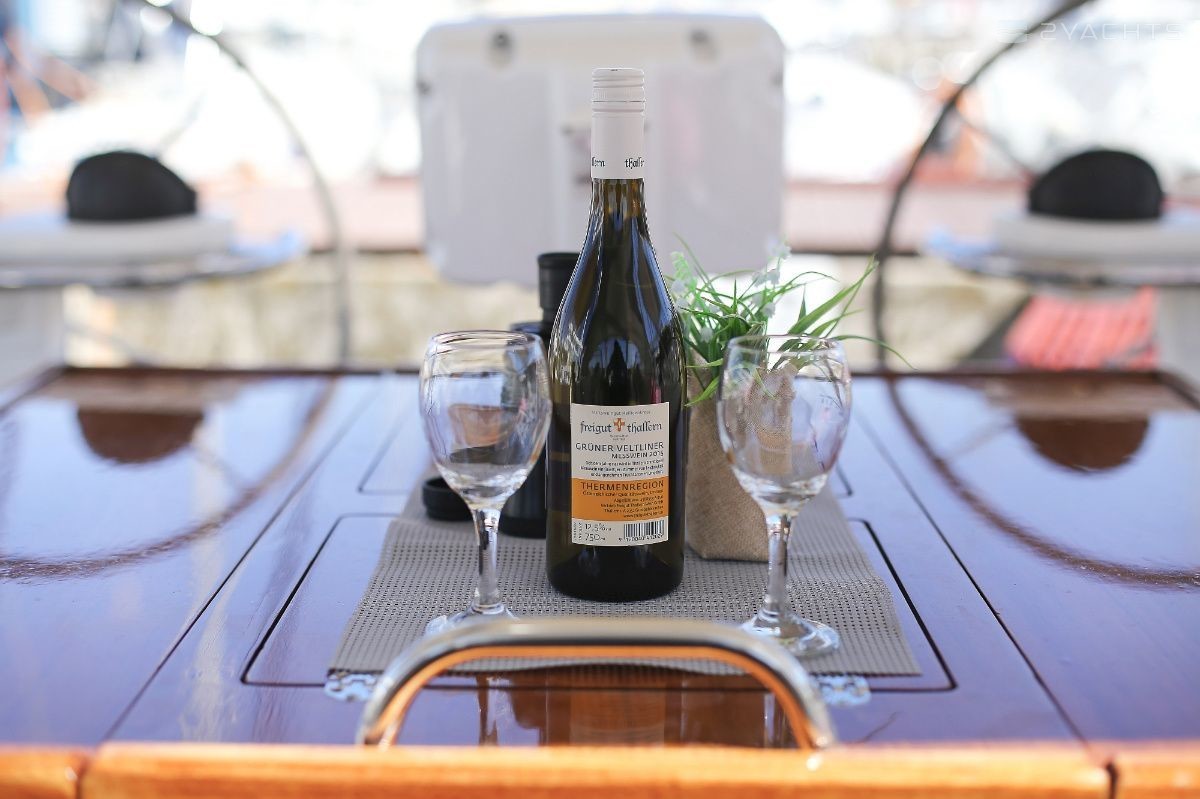 Kokoma can accommodate up to 9 people in 4 double cabins and a saloon with 1 extra bed. Pillows and blankets are included in the price.
