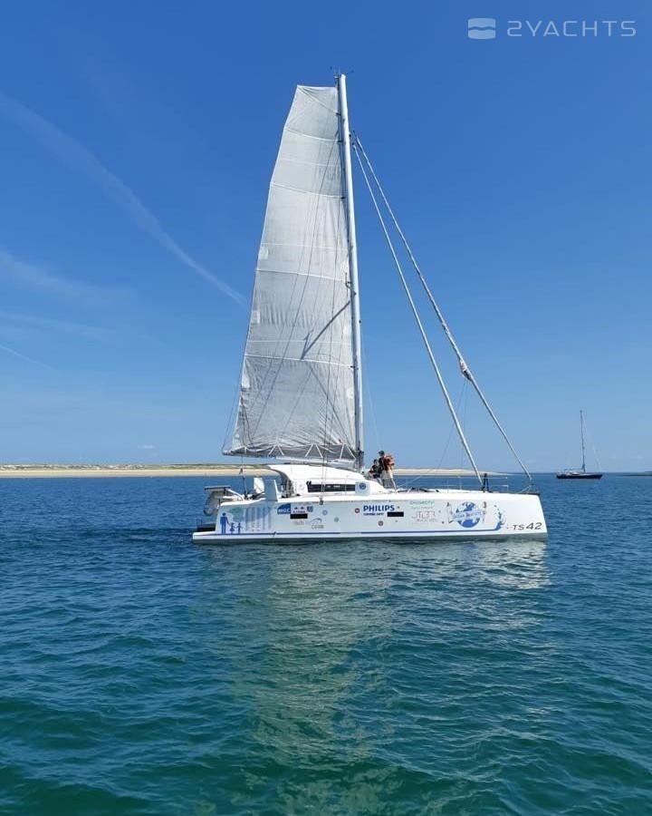 4-cabin catamaran TS 42 - Castor was built in 2016, and it is docked in Port de Dahouët, France.