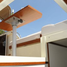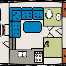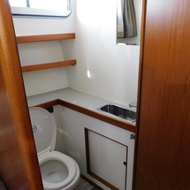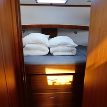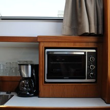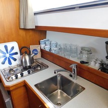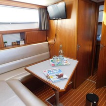 Boat equipment features bow thruster. It also boasts a flat screen tv, heating, an audio system and inside speakers. The fully-equipped galley includes a microwave, coffee machine, cooker, sink and kitchen utensils.