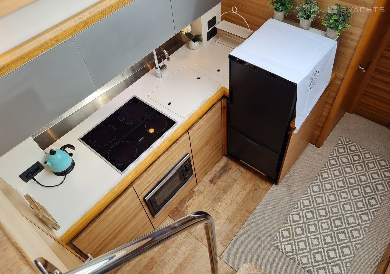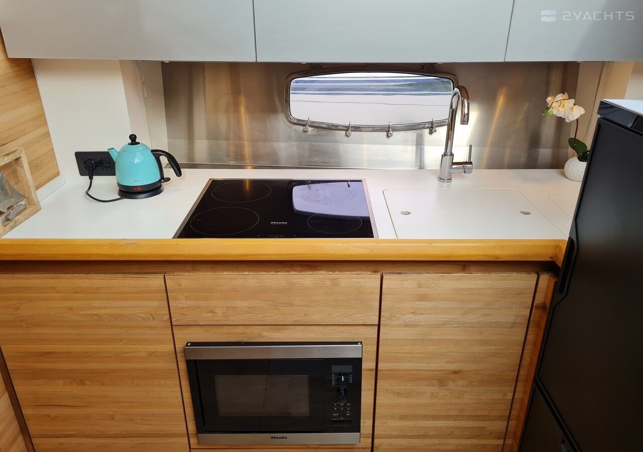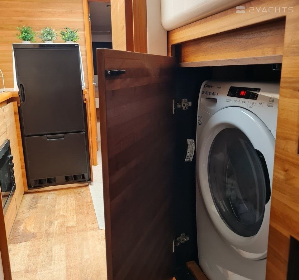 Boat equipment features generator, salon gps plotter, bbq, bimini and outside gps plotter. It also boasts a flat screen tv, heating, air conditioning, washing machine and audio system. The fully-equipped galley includes a microwave, dishwasher, ice maker, freezer and oven.