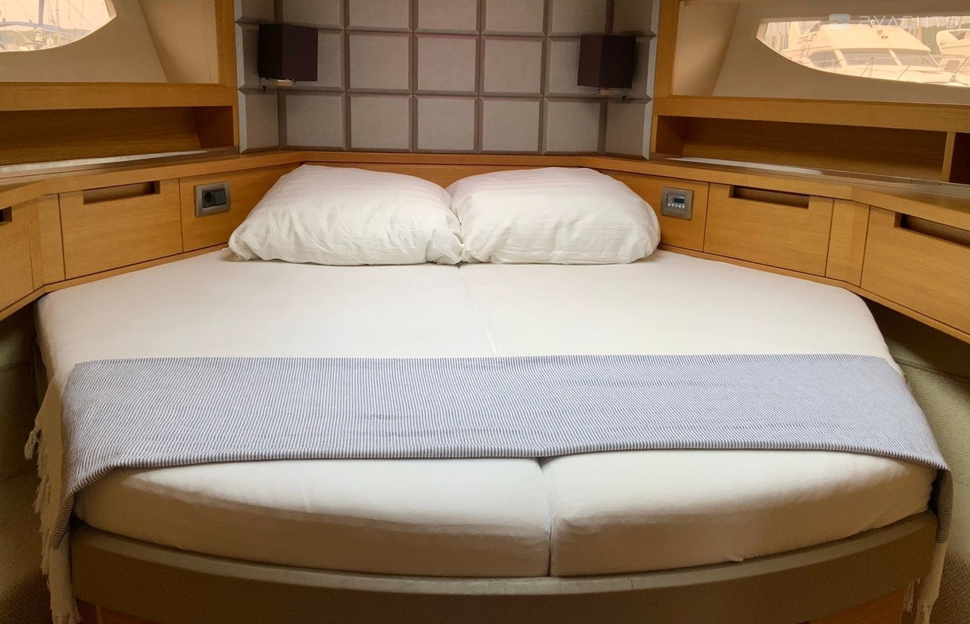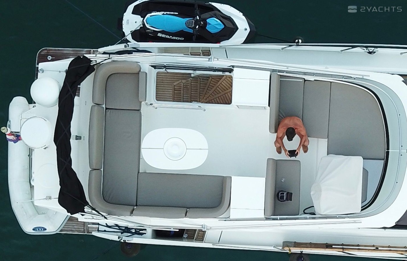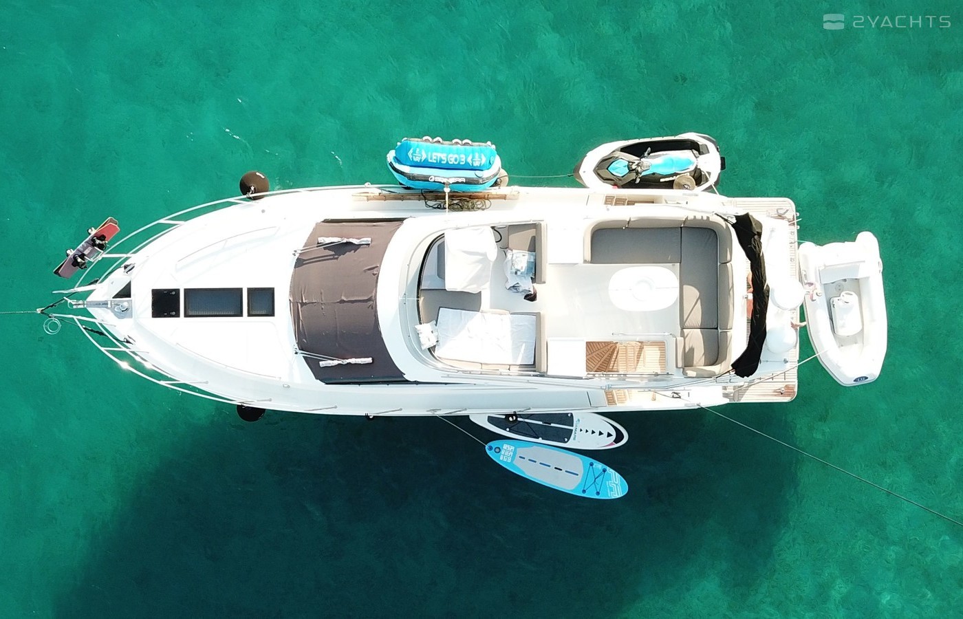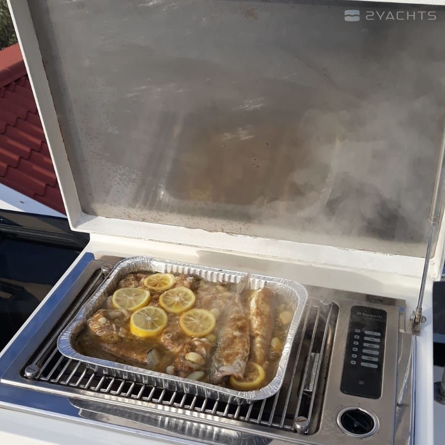 Boat equipment features radar, generator, salon gps plotter, bbq and bimini. It also boasts a jet ski, flat screen tv, heating, air conditioning and audio system. The fully-equipped galley includes a microwave, ice maker, freezer, cooker and sink.