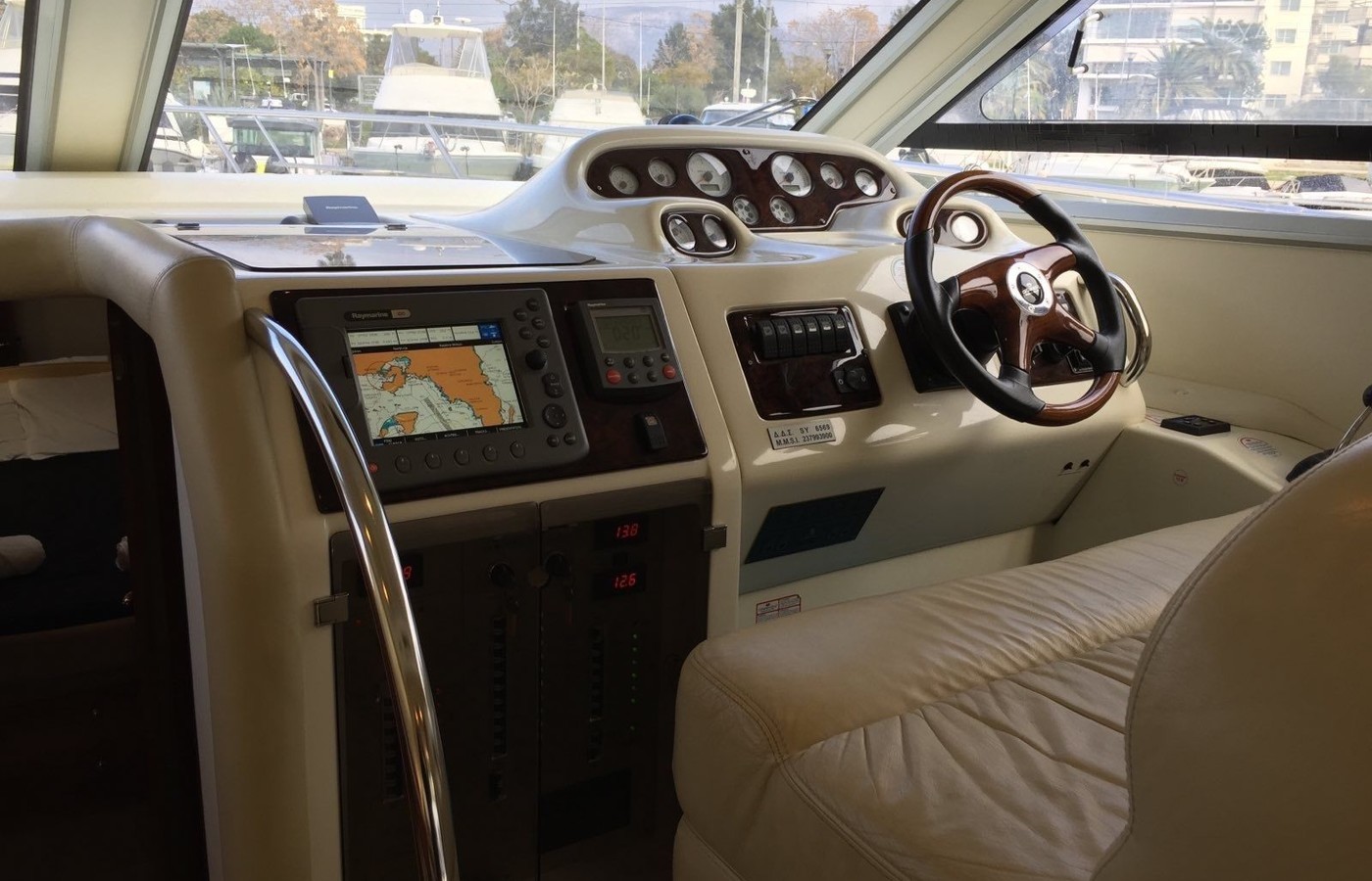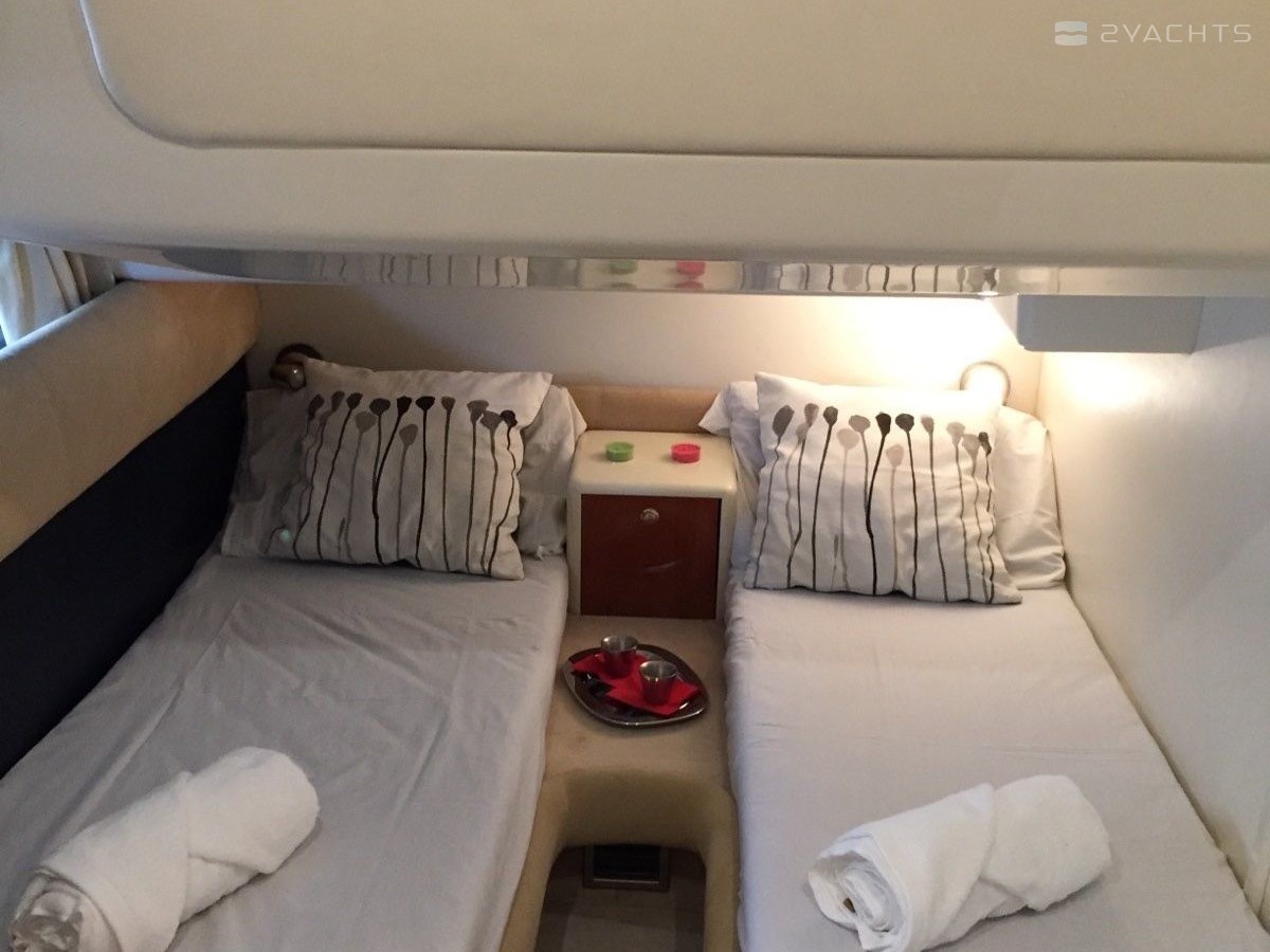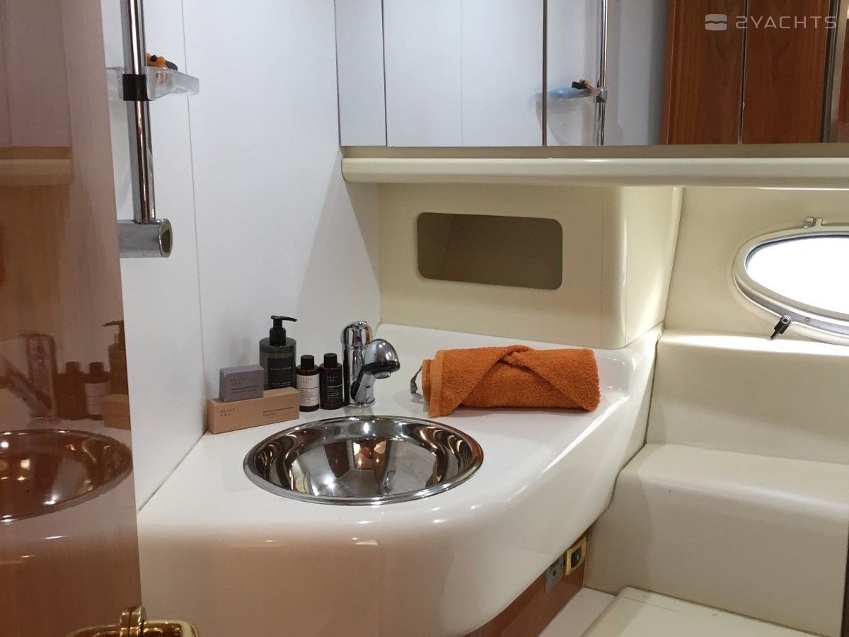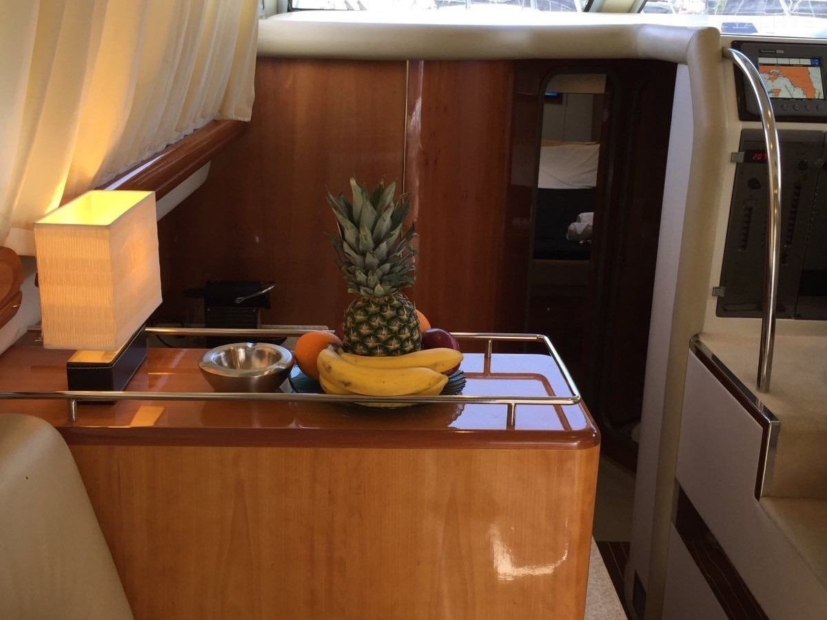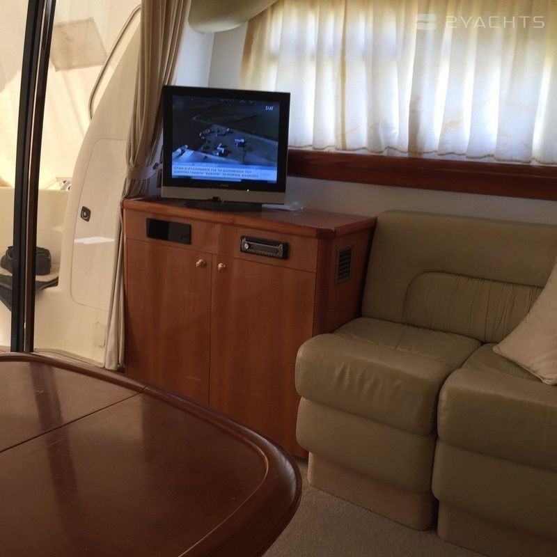 Boat equipment features generator, salon gps plotter and bow thruster. It also boasts a flat screen tv, heating, air conditioning, an audio system and outside speakers. The fully-equipped galley includes a microwave, dishwasher, ice maker, freezer and coffee machine.