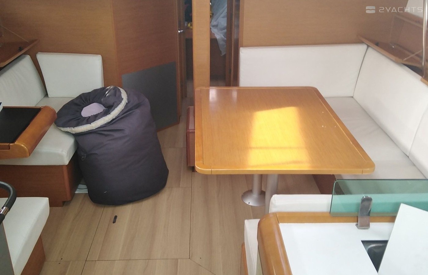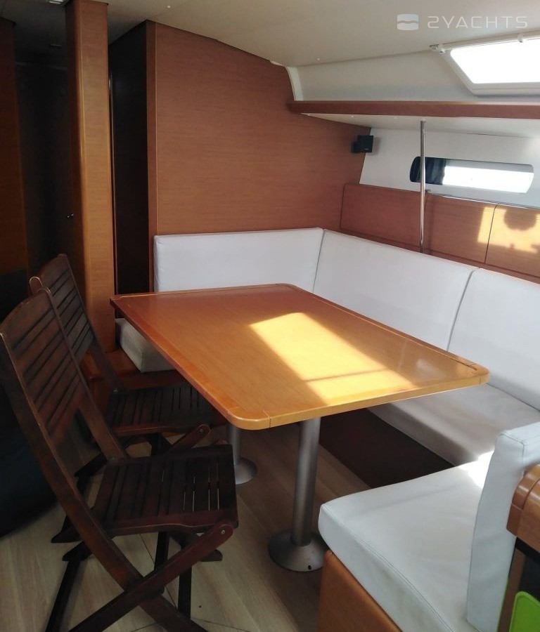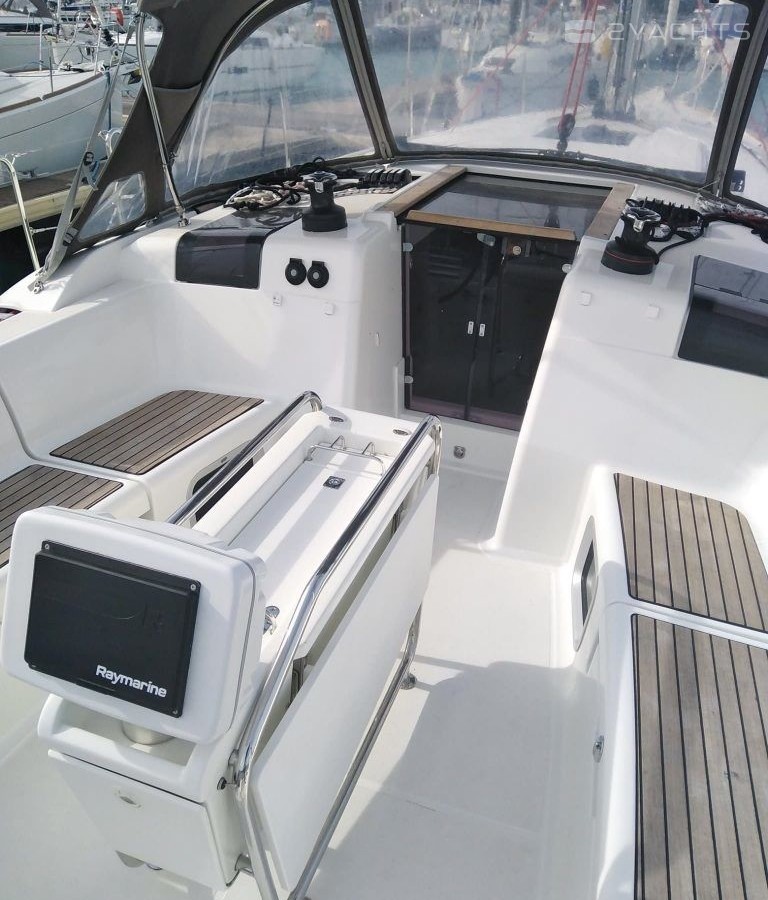 Boat equipment features classical mainsail and outside gps plotter. It also boasts a heating, an audio system and inside speakers. The fully-equipped galley includes an oven, cooker, sink and kitchen utensils.