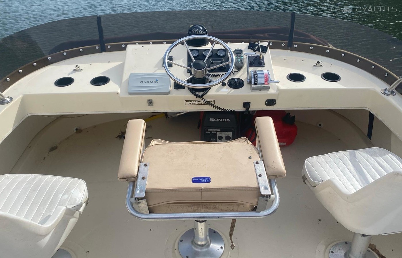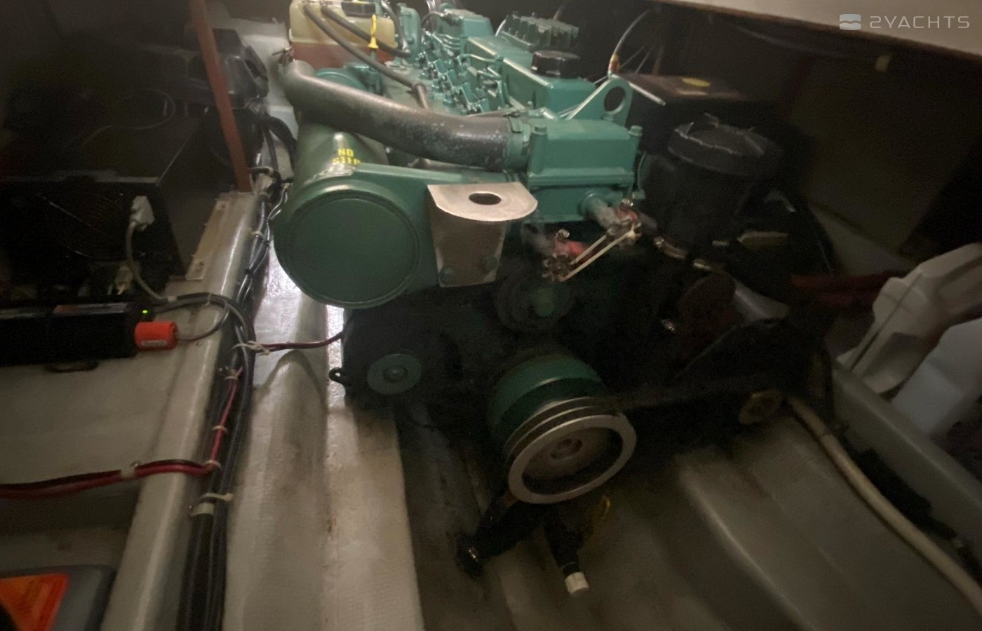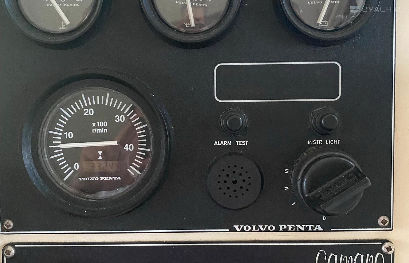 The Camano Troll is a 31-foot boat with a flybridge that includes three pedestal seats, an adjustable centre seat with slider, and a stainless steel steering wheel. Built in British Columbia and designed for this coast, an area well known for high quality boats, the Troll was designed by Bob Warman to meet the demand for a boat with a comfortable 12-knot cruise speed that retains a high resale value. With a 10-foot 6-inch beam for stability and 5 feet of freeboard at the bow, weather is not going to threaten this boat. The Troll runs well over 18 knots with a single 200 hp Volvo Diesel. The interior offers the same usable room as many 33-foot production boats and is much easier to handle. With the standard bow thruster one person can dock the boat even in very tight spots. The Camano features an open cruising layout (salon and aft deck on the same level), with a full-size bridge. The open, bright interior provides great visibility from any part of the seating area with its picture window view. The interior is light and friendly. Cabinets and trim are mahogany, the cushions are covered with premium fabrics and the floor is either oak or carpeted. Accommodations are as open as possible - the salon measures 8-feet, 10-inches by 10 feet and is on the same level as the aft deck which is 40 square feet. The galley and head are half a level down, with a U-shaped galley out of the traffic area but still open to the salon. With a large counter area extending under the sidedecks there is lots of room for full-sized stove with oven, refrigerator, microwave, and large sink. Storage space is provided including dishlocker outboard of the fridge. The shower is built in as a part of the head area. The dinette easily converts to a double berth while the forward berth has a filler available to make a double. The Camano comes well equipped with 110-V dockside package, pressurized hot and cold water at the galley, depthsounder with speedometer and log, VHF-radio, AM-FM stereo cassette radio, and 17 lb. Bruce anchor with lead chain and rod. HVAC. The Keelform hull is the result of a science program of the University of British Columbia and Camano Marine. Keelform is a unique bottom shape with large displacement keel and very wide waterline beam. Test results show almost no planing angle change or "hump" in the horsepower curve between displacement and planing speeds which, in the case of a boat this size, is between 7 and 15 knots. While most semidisplacement boats are straining and reaching their horsepower limit, the Camano is cruising comfortably up to 18 knots. The hull reduces fuel consumption in the most widely used speed range - between 12 and 18 knots; can be stabilized to prevent the boat from rolling in rough seas; runs 19 - 20 knots top speed, with a single 200 hp Diesel engine; and provides a smooth, dry ride in rough water because of a special flare in the bow section. Engine failures are extremely rare with Diesel engines and if they occur, 99 per cent of all cases are due to contaminated fuel. Commercial boats and fishing vessels which operate year-round in all kinds of weather conditions usually have only one diesel engine. Most boat builders whose brochures mention "hand-laid fiberglass" use chopper guns to replace the traditional fiberglass mats by "chopped strand," which are only two-inch long glass fibers wetted with resin by the "chopper gun" and sprayed into the mold. Only the woven rovings are rolled or "laid in" by hand. The hull of the Troll is 100 per cent hand-laid, with no "chopped strand," and thicker than the hulls of comparable production boats. The boat has a heavily built, very strong inner liner laminated into the lower portion of the hull; the bulkheads are thoroughly laminated into place from both sides as are the other parts of the interior. The impact and tear strength of a Camano hull is ten times higher than most production boats. Running aground with the Troll is not a problem. Prop, prop shaft and rudder of the Camano are protected by a heavily reinforced skeg and keel shoe. The inboard diesel combined with the available electric bow thruster result in a handling advantage even over twin stern drives.