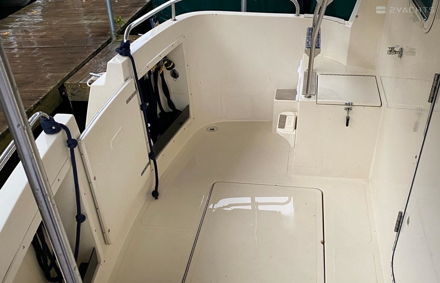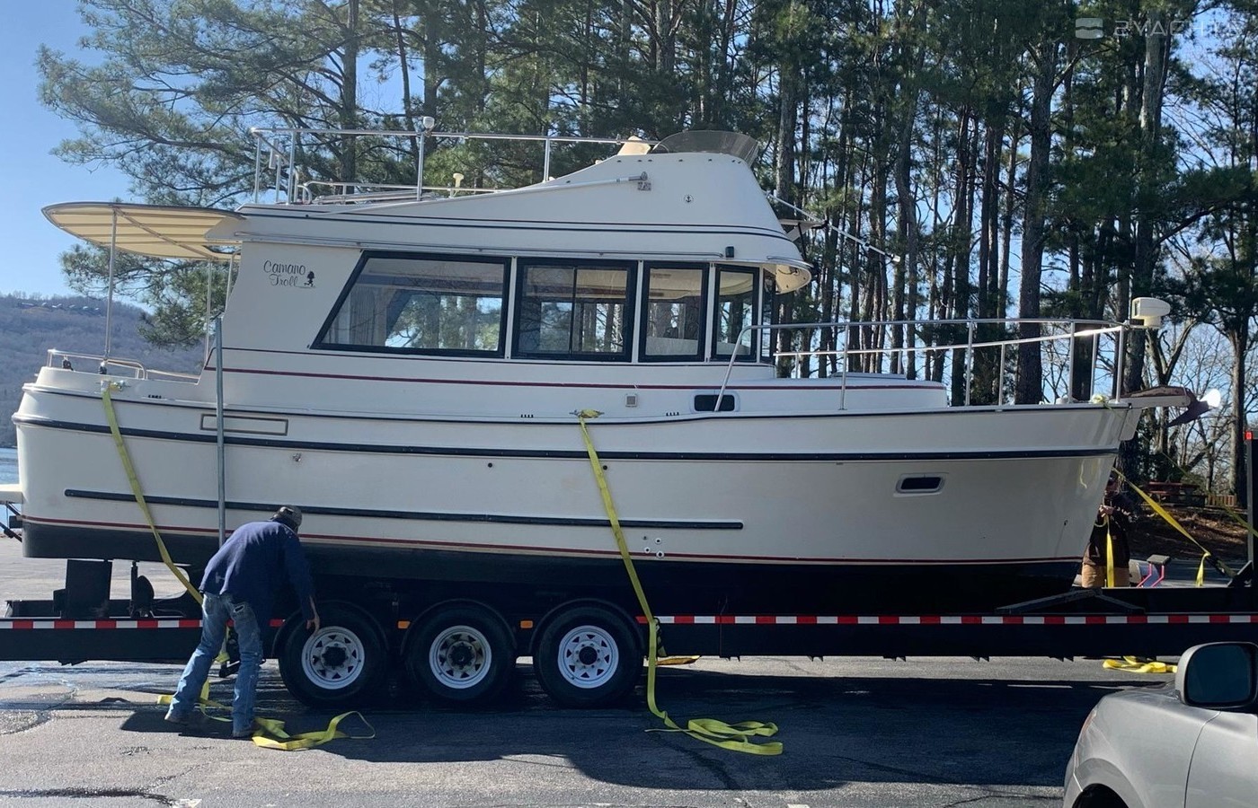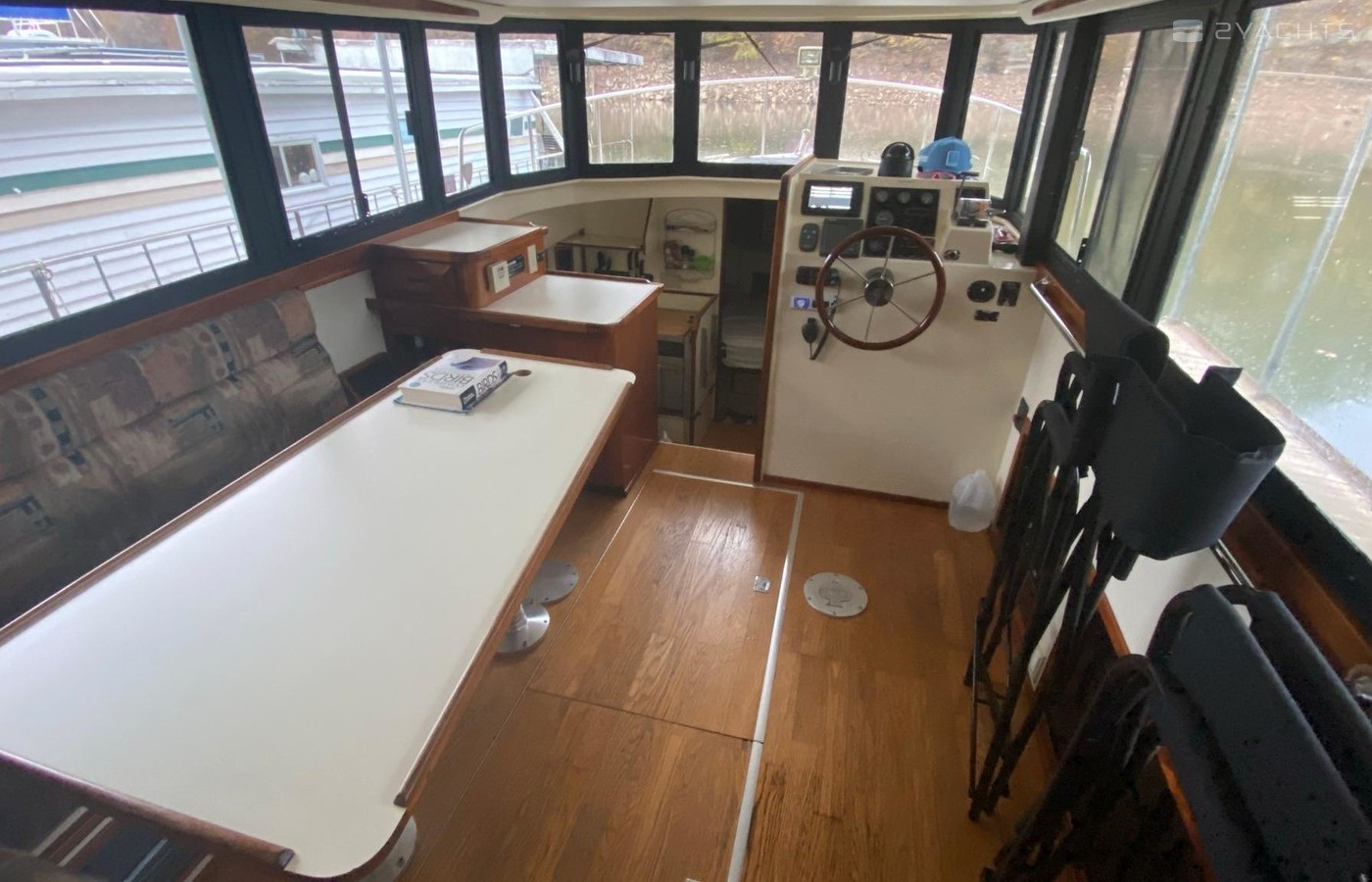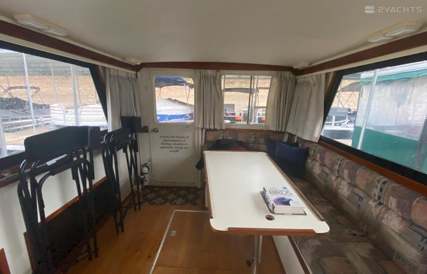 The Camano Troll is a 31-foot boat with a flybridge that includes three pedestal seats, an adjustable centre seat with slider, and a stainless steel steering wheel. Built in British Columbia and designed for this coast, an area well known for high quality boats, the Troll was designed by Bob Warman to meet the demand for a boat with a comfortable 12-knot cruise speed that retains a high resale value. With a 10-foot 6-inch beam for stability and 5 feet of freeboard at the bow, weather is not going to threaten this boat. The Troll runs well over 18 knots with a single 200 hp Volvo Diesel. The interior offers the same usable room as many 33-foot production boats and is much easier to handle. With the standard bow thruster one person can dock the boat even in very tight spots. The Camano features an open cruising layout (salon and aft deck on the same level), with a full-size bridge. The open, bright interior provides great visibility from any part of the seating area with its picture window view. The interior is light and friendly. Cabinets and trim are mahogany, the cushions are covered with premium fabrics and the floor is either oak or carpeted. Accommodations are as open as possible - the salon measures 8-feet, 10-inches by 10 feet and is on the same level as the aft deck which is 40 square feet. The galley and head are half a level down, with a U-shaped galley out of the traffic area but still open to the salon. With a large counter area extending under the sidedecks there is lots of room for full-sized stove with oven, refrigerator, microwave, and large sink. Storage space is provided including dishlocker outboard of the fridge. The shower is built in as a part of the head area. The dinette easily converts to a double berth while the forward berth has a filler available to make a double. The Camano comes well equipped with 110-V dockside package, pressurized hot and cold water at the galley, depthsounder with speedometer and log, VHF-radio, AM-FM stereo cassette radio, and 17 lb. Bruce anchor with lead chain and rod. HVAC. The Keelform hull is the result of a science program of the University of British Columbia and Camano Marine. Keelform is a unique bottom shape with large displacement keel and very wide waterline beam. Test results show almost no planing angle change or "hump" in the horsepower curve between displacement and planing speeds which, in the case of a boat this size, is between 7 and 15 knots. While most semidisplacement boats are straining and reaching their horsepower limit, the Camano is cruising comfortably up to 18 knots. The hull reduces fuel consumption in the most widely used speed range - between 12 and 18 knots; can be stabilized to prevent the boat from rolling in rough seas; runs 19 - 20 knots top speed, with a single 200 hp Diesel engine; and provides a smooth, dry ride in rough water because of a special flare in the bow section. Engine failures are extremely rare with Diesel engines and if they occur, 99 per cent of all cases are due to contaminated fuel. Commercial boats and fishing vessels which operate year-round in all kinds of weather conditions usually have only one diesel engine. Most boat builders whose brochures mention "hand-laid fiberglass" use chopper guns to replace the traditional fiberglass mats by "chopped strand," which are only two-inch long glass fibers wetted with resin by the "chopper gun" and sprayed into the mold. Only the woven rovings are rolled or "laid in" by hand. The hull of the Troll is 100 per cent hand-laid, with no "chopped strand," and thicker than the hulls of comparable production boats. The boat has a heavily built, very strong inner liner laminated into the lower portion of the hull; the bulkheads are thoroughly laminated into place from both sides as are the other parts of the interior. The impact and tear strength of a Camano hull is ten times higher than most production boats. Running aground with the Troll is not a problem. Prop, prop shaft and rudder of the Camano are protected by a heavily reinforced skeg and keel shoe. The inboard diesel combined with the available electric bow thruster result in a handling advantage even over twin stern drives.