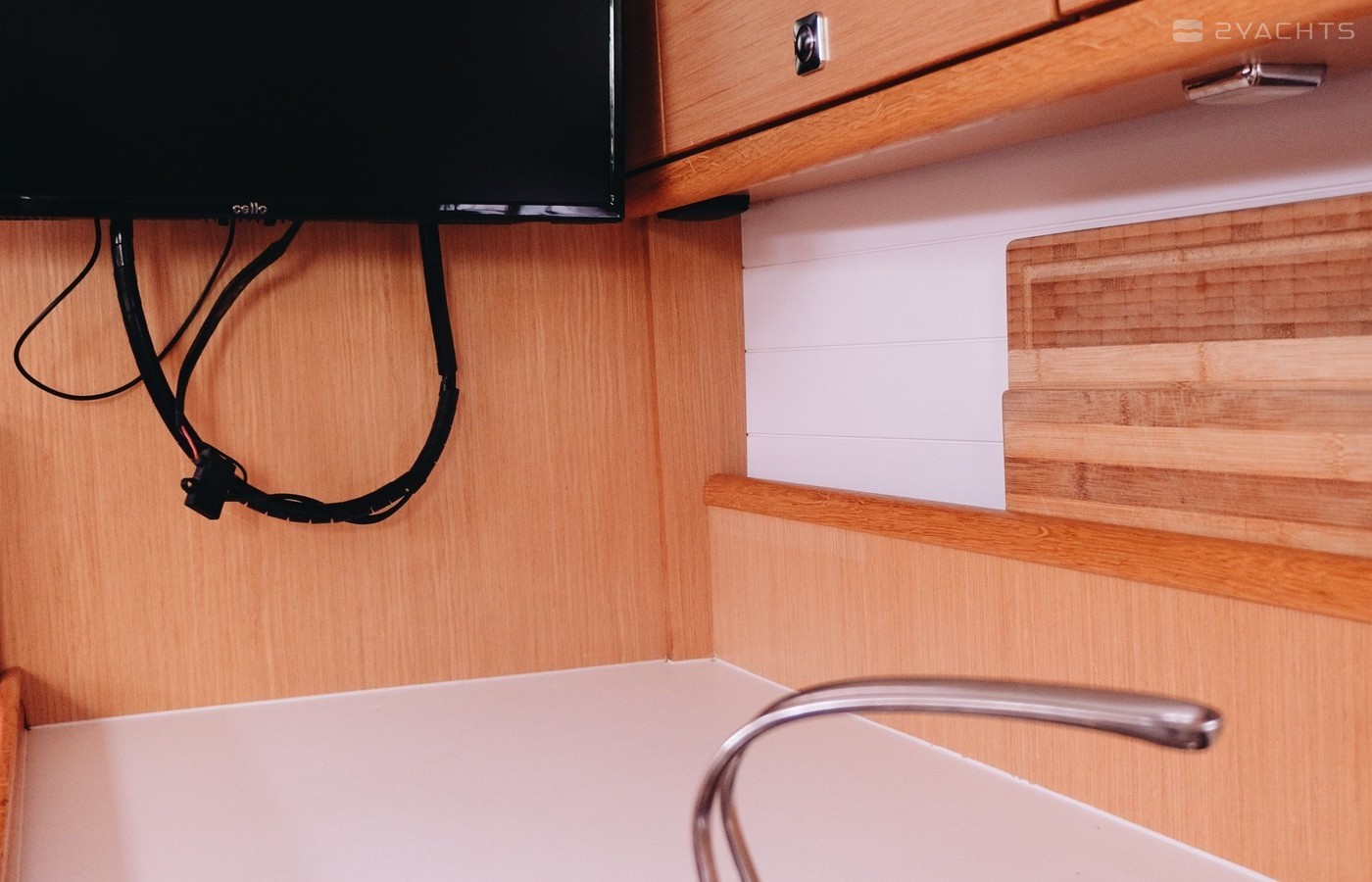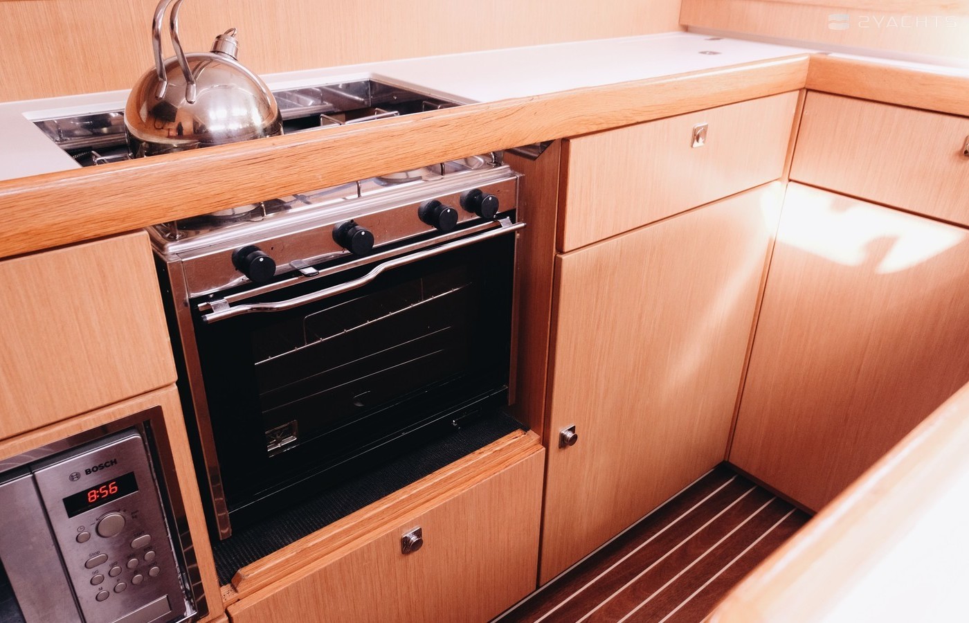 Boat equipment features rolling mainsail, electric winches, solar panels, generator, bimini and bow thruster. It also boasts a flat screen tv, heating, an audio system, outside speakers and inside speakers. The fully-equipped galley includes a microwave, ice maker, oven, cooker and sink.