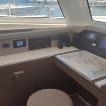 Boat equipment features classical mainsail, electric winches, solar panels, bbq, bimini and outside gps plotter. It also boasts a heating, air conditioning, an audio system, outside speakers and flybridge. The fully-equipped galley includes a freezer, oven, cooker, sink and kitchen utensils.
