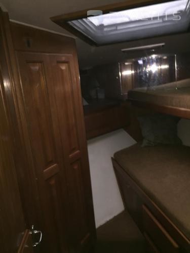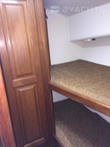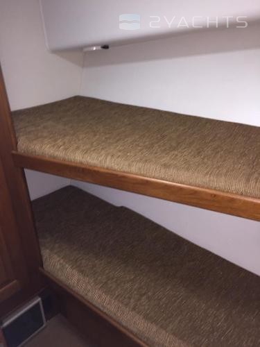 The master suite is on the right as you walk down the stairs. Queen bed with private shower, toilet, and sink. To the left down the stairs is a 2-bed bunk room. Next door is the fishing rod closet. Next is another shower, toilet, and sink. Straight forward is a 2 bunk room in the bow. All furniture, rugs, ceiling are in good shape.
