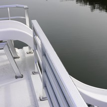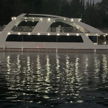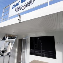 Extended rear deck w/ enclosed engine area and storage, bow beaching plates, 36' aluminum/fiberglass shade top, wet bar w/sink, mounted barstools, flybridge helm w/ sun lounge day bed, waterslide, 2nd level bathroom pod and closet storage pod, elite glass windows, aft deck shower, windlass, chrome trim to all arches, aluminum boarding plank.