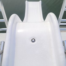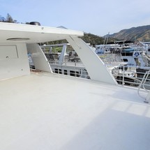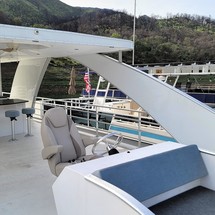 Exterior and 2nd Level: Extended rear deck w/ enclosed engine area and storage, bow beaching plates, 36' aluminum/fiberglass shade top, wet bar w/sink, mounted barstools, flybridge helm w/ sun lounge day bed, waterslide, 2nd level bathroom pod and closet storage pod, elite glass windows, aft deck shower, windlass, chrome trim to all arches, aluminum boarding plank.