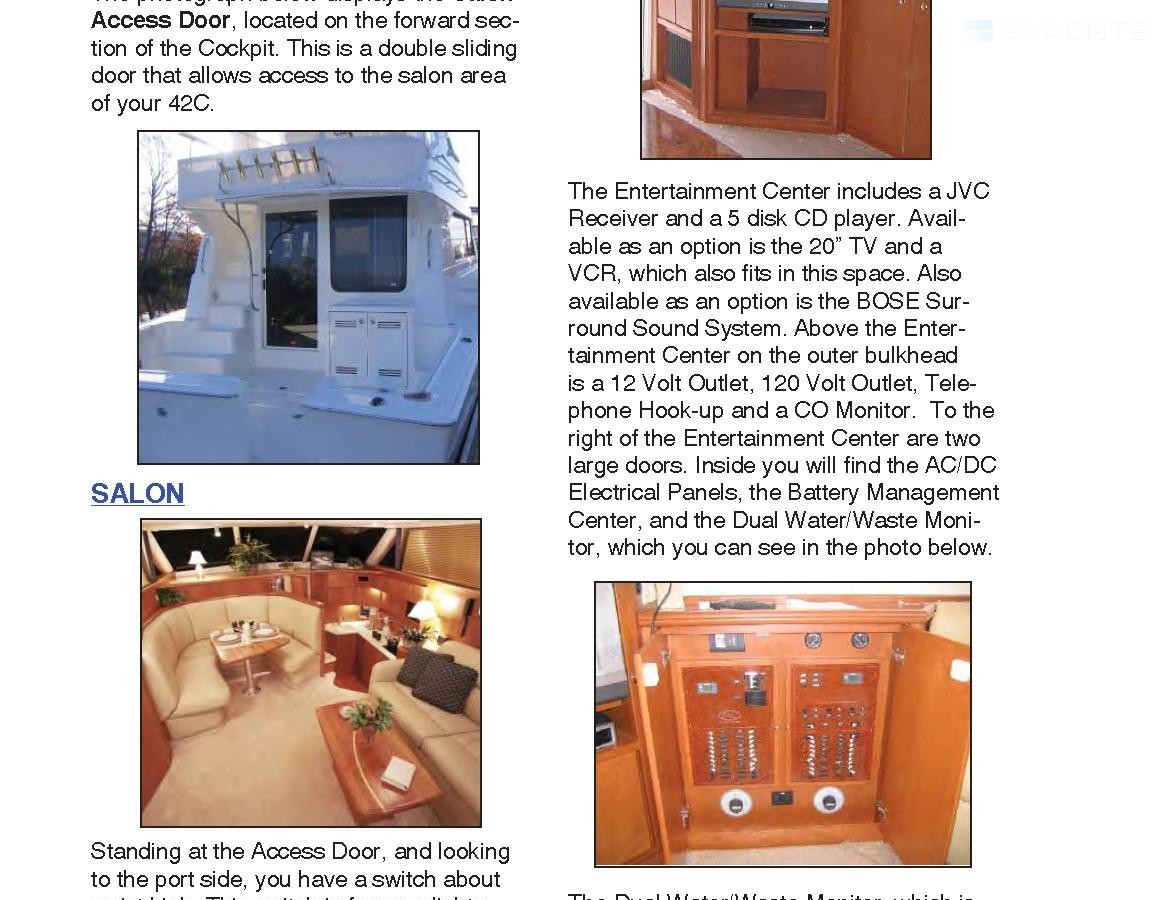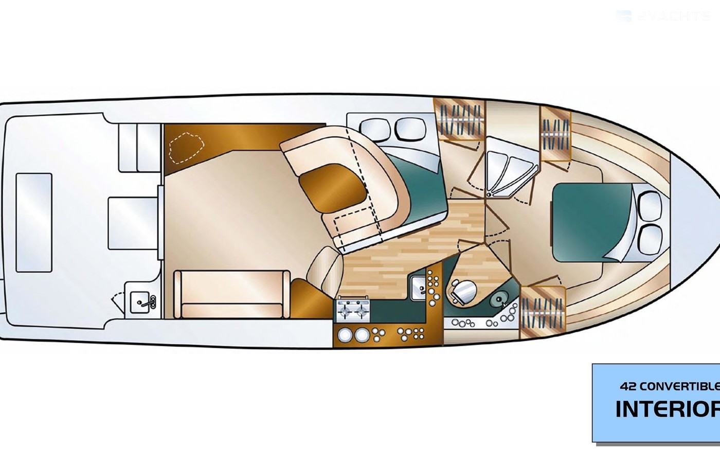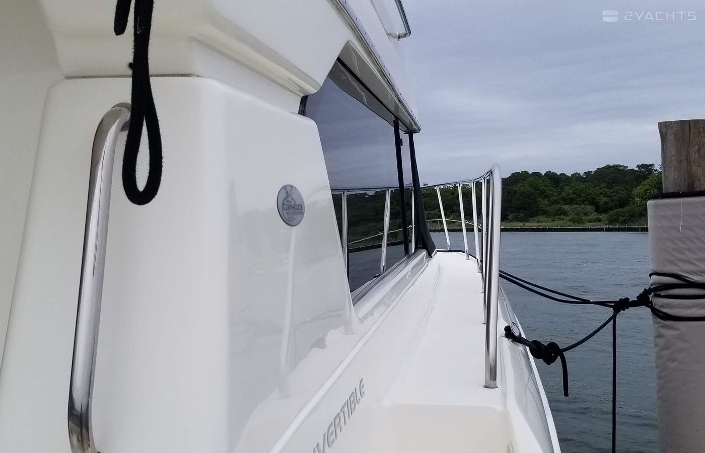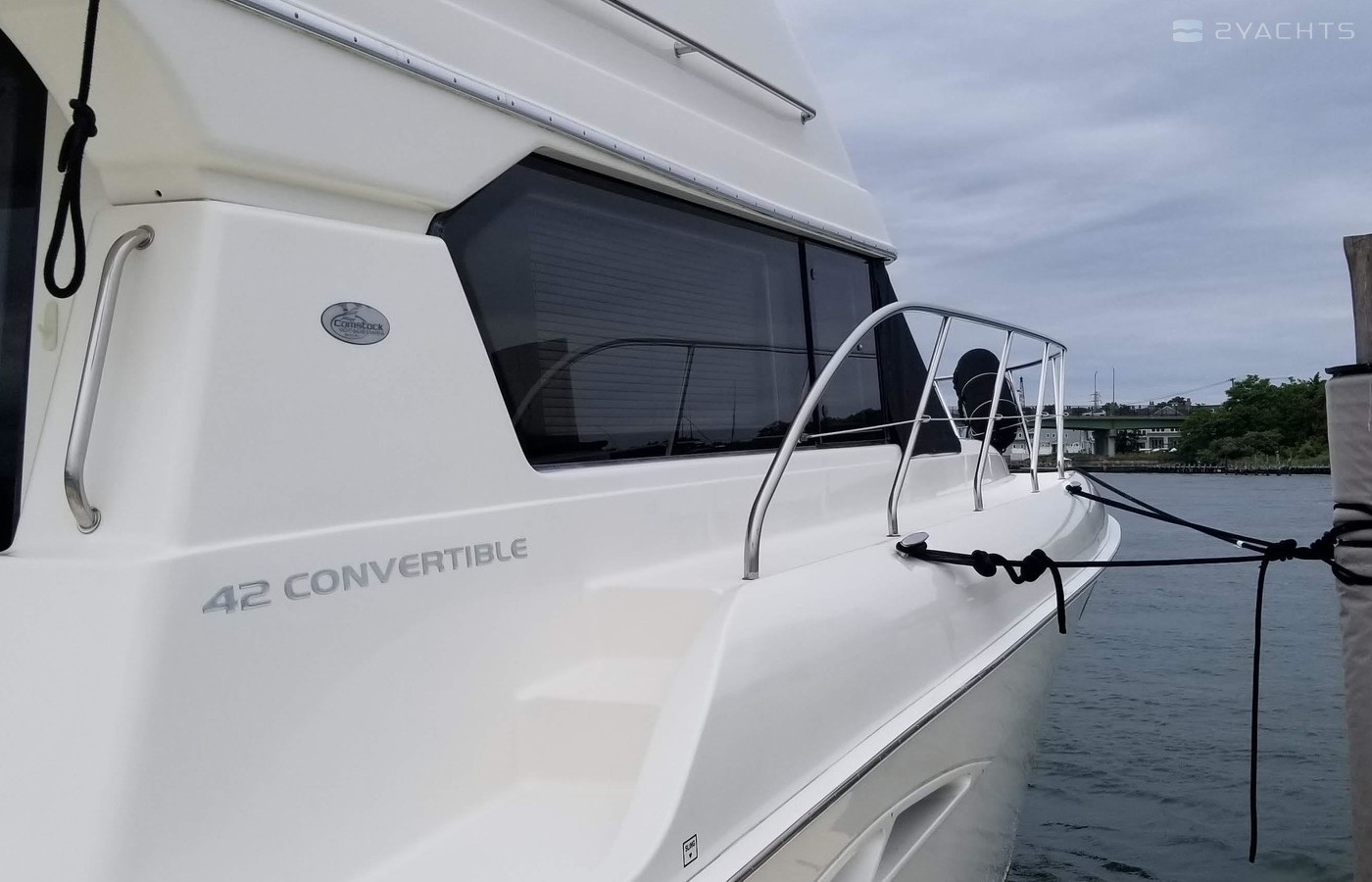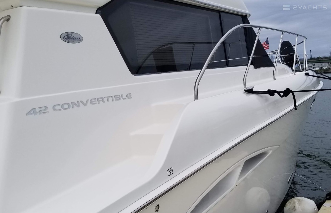 The beamy 42 Convetible utilizes space to a remarkable degree, with ample amenities and storage contributing to the well-being of owners and guests, alike. Consider the 42 Convertible's two luxurious double-berth staterooms served by a split-head and stall shower arrangement. And the enormous booth settee wrapping a solid cherry table angled to face the convertible sofa and entertainment center. In the 42 Convertible, all combine in a superbly styled cabin perfect for conversation or more lively demonstrations of satisfaction. The impressive galley is integrated into the layout. You will also be amazed by the generous expanse of cherry wood, which warms and enriches the interior. Topside on the 42 Convertible, the captain will appreciate an efficient helm station and the power of twin Yanmar Deisels engines. And all will be impressed by her smartly restyled exterior lines.