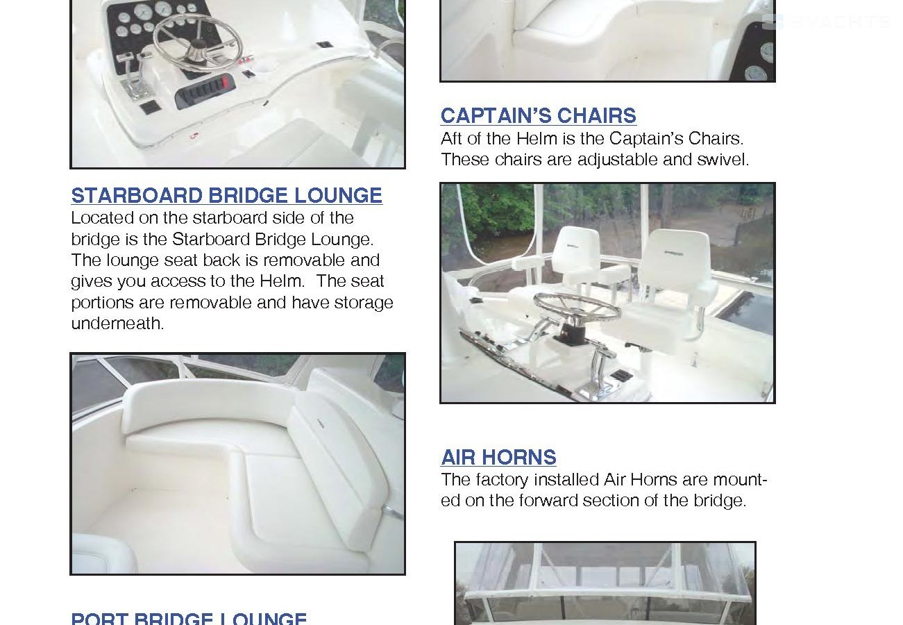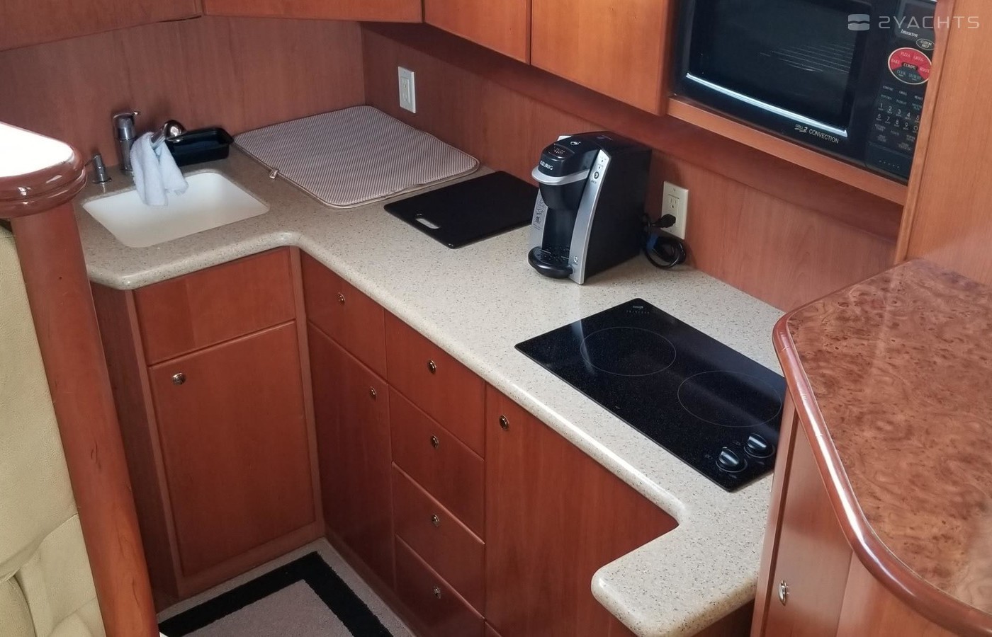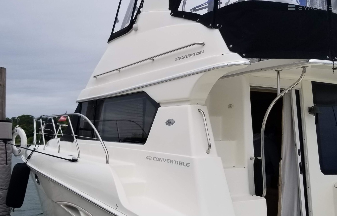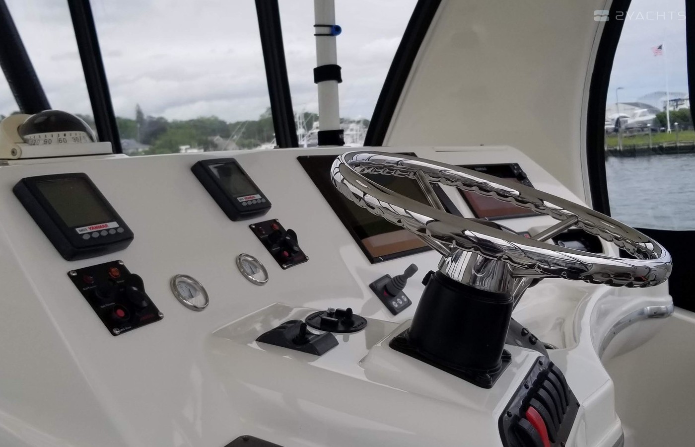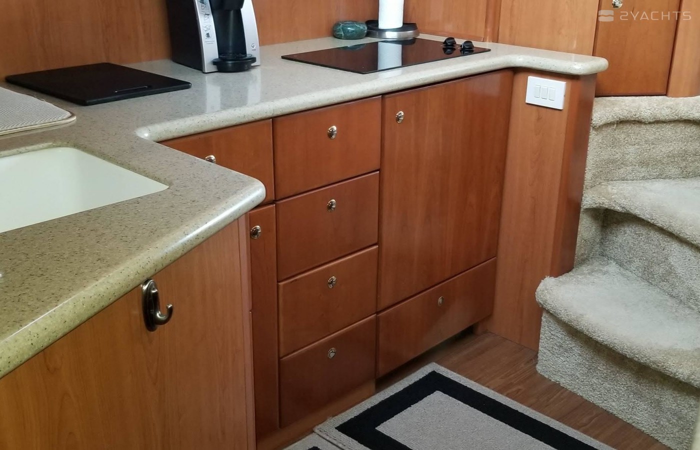 The beamy 42 Convetible utilizes space to a remarkable degree, with ample amenities and storage contributing to the well-being of owners and guests, alike. Consider the 42 Convertible's two luxurious double-berth staterooms served by a split-head and stall shower arrangement. And the enormous booth settee wrapping a solid cherry table angled to face the convertible sofa and entertainment center. In the 42 Convertible, all combine in a superbly styled cabin perfect for conversation or more lively demonstrations of satisfaction. The impressive galley is integrated into the layout. You will also be amazed by the generous expanse of cherry wood, which warms and enriches the interior. Topside on the 42 Convertible, the captain will appreciate an efficient helm station and the power of twin Yanmar Deisels engines. And all will be impressed by her smartly restyled exterior lines.