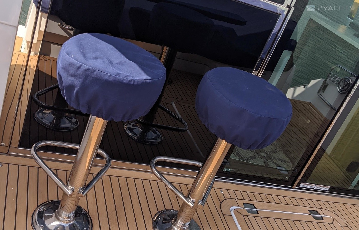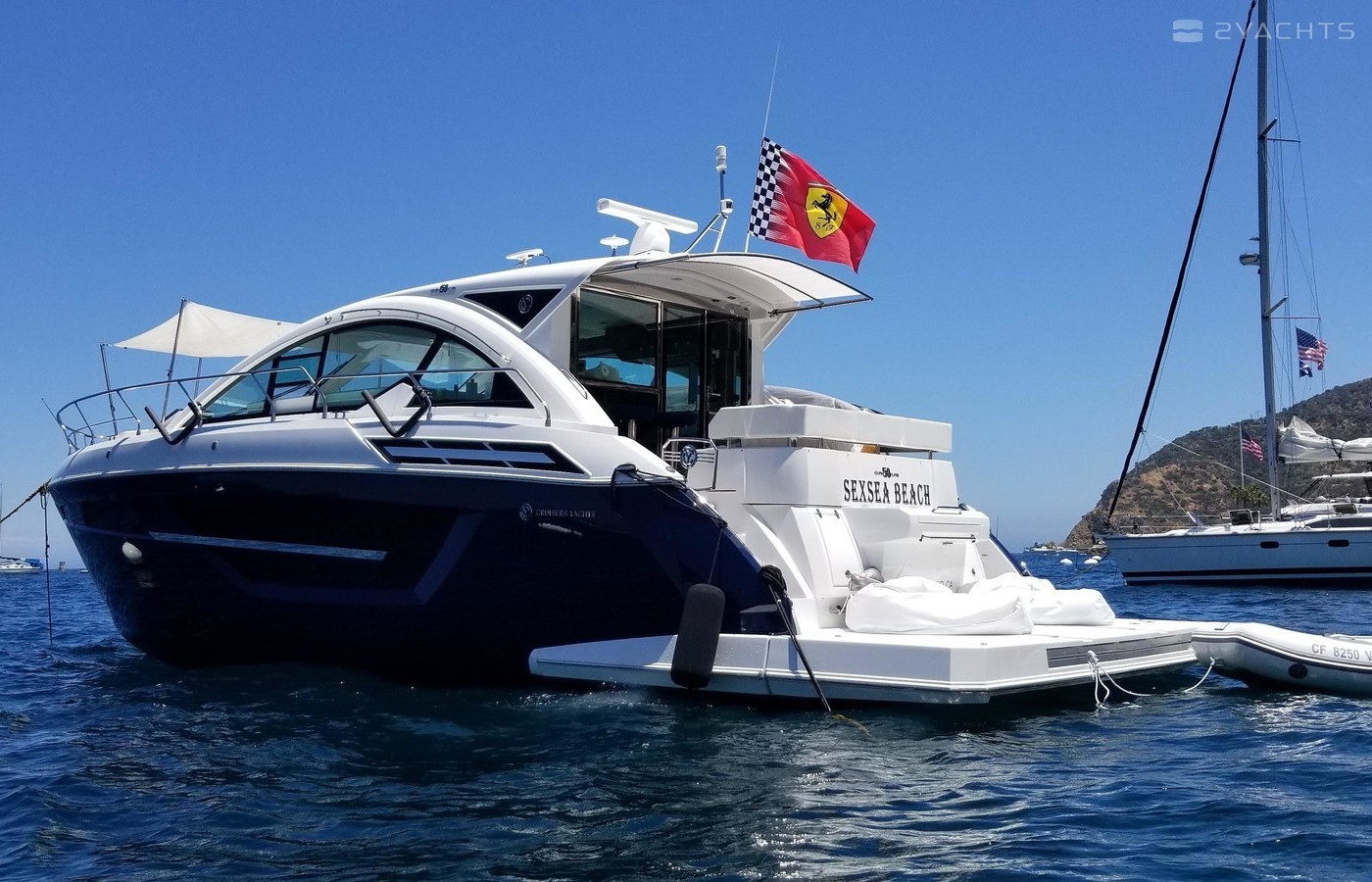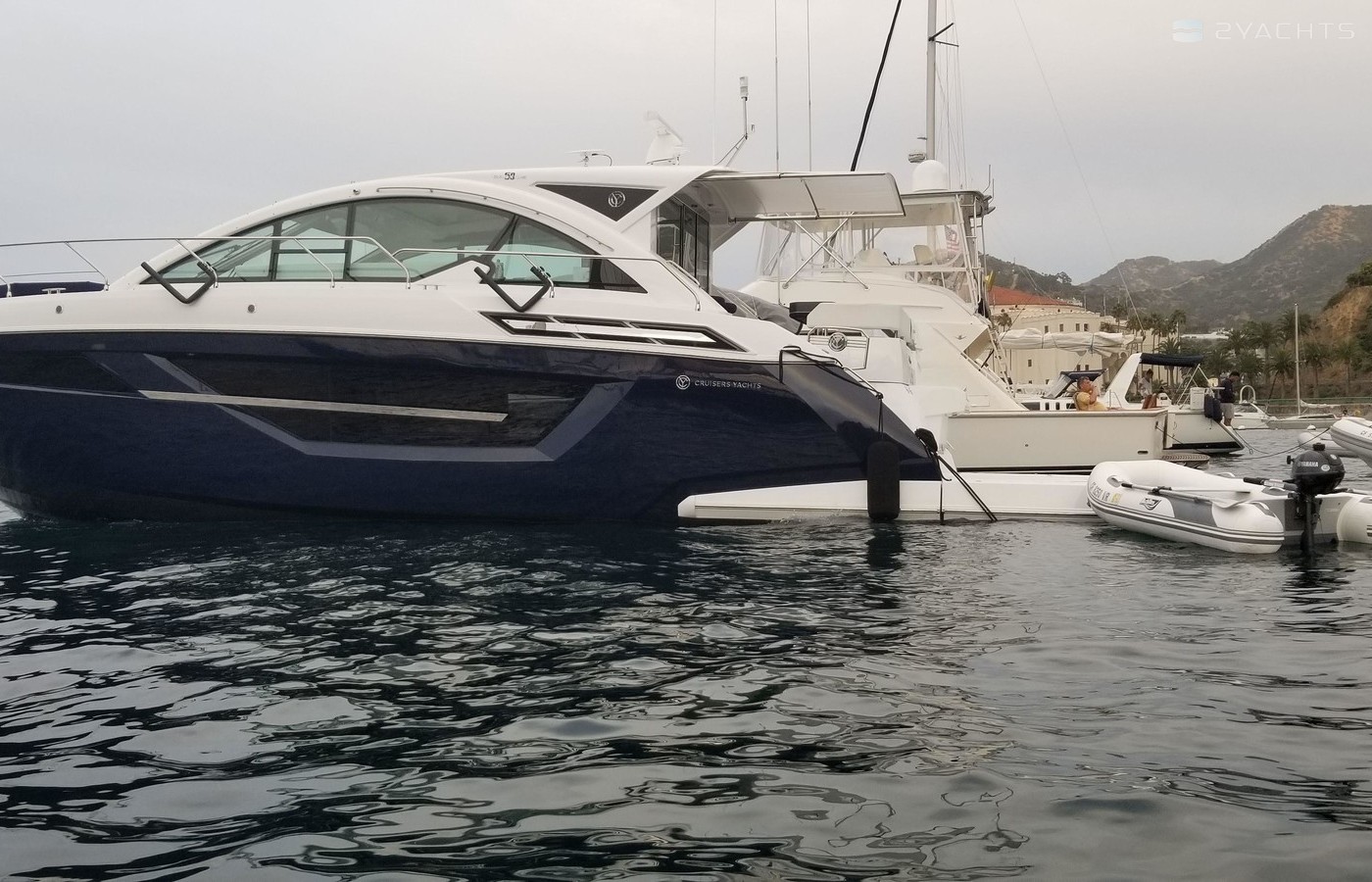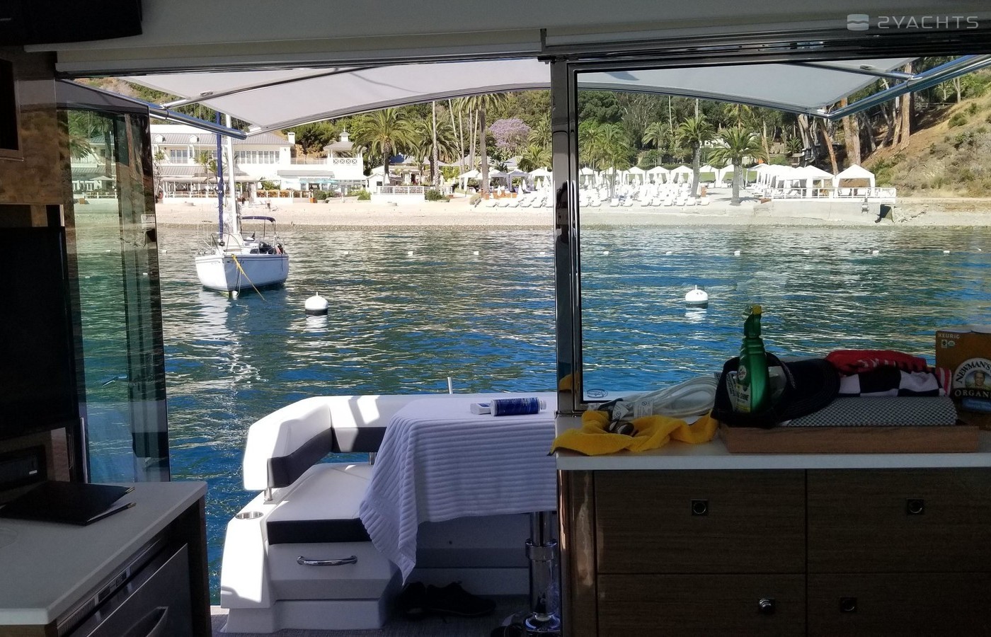 This Yacht is fully loaded and has been equiped and set up by a captain with 50 years experience and for extended stays at Catalina Island. A 50 foot prime mooring in front of descanso beach is optional. The yacht is equipped with a state of the art blue ocean water maker with auto flush. In addition an inverter with a huge battery bank powering all outlets TV monitors dvd players and appliances as a back up to the onan generator. The hull is the optional paint to sample Navy blue which blows away a white hull. It's the classic nautical color. The swim step has deployable ladders / stairs to provide easy access. The swim step was set up with stainless hold downs for the optional brand new 260 Nouvoraniawith a 40 hp fuel injected Honda. The yacht has a heavily upgraded fusion sound system through our including the tender. The yacht comes with the extended warranty through Volvo through 2024 which is transferrable. The yacht was just hauled and bottom painted as well as fully serviced including all warrant repairs discovered through servicing. The yacht has every conceivable option and upgrade including a seakeeper Stabilizer 7 that virtually eliminates roll. The yacht can be moored in rough seas and roll is totally eliminated. This Yacht lists for 2 million new and has 100s of thousands in options above that . The cockpit and stars are finished in teak flex which looks identical to teak without the maintenance.