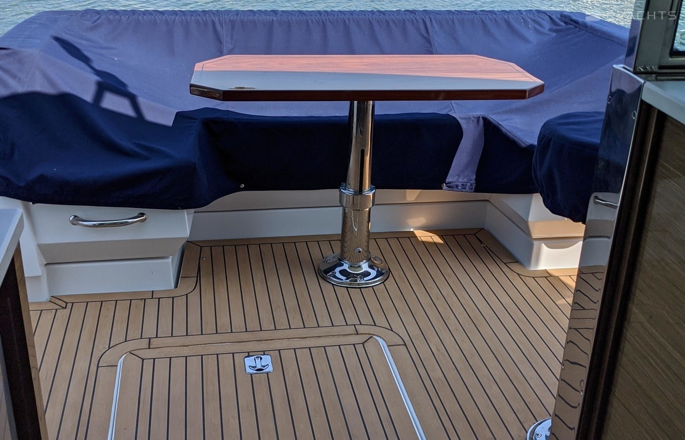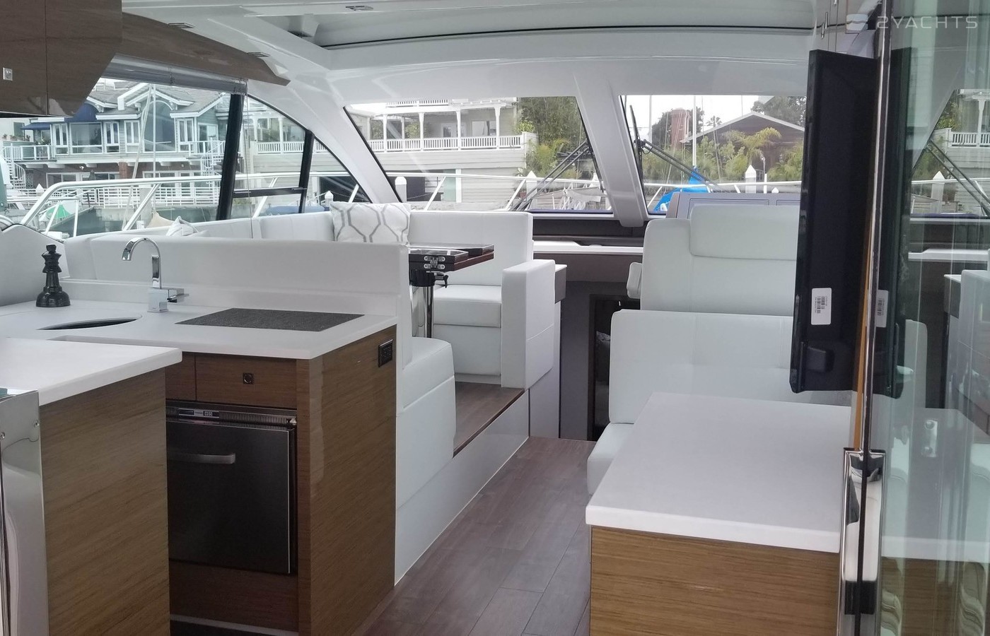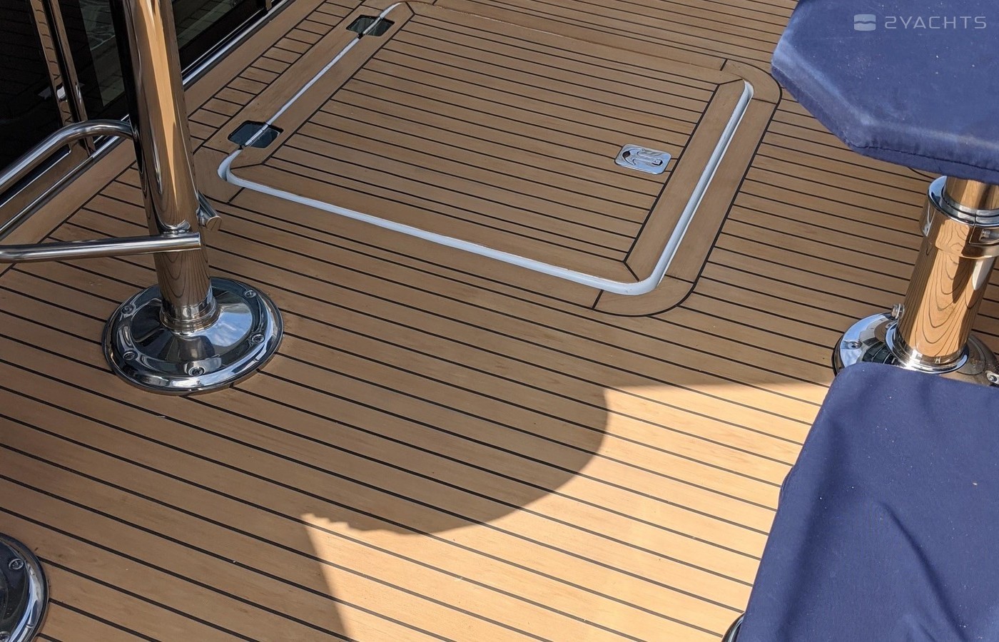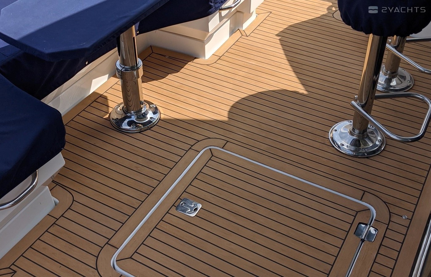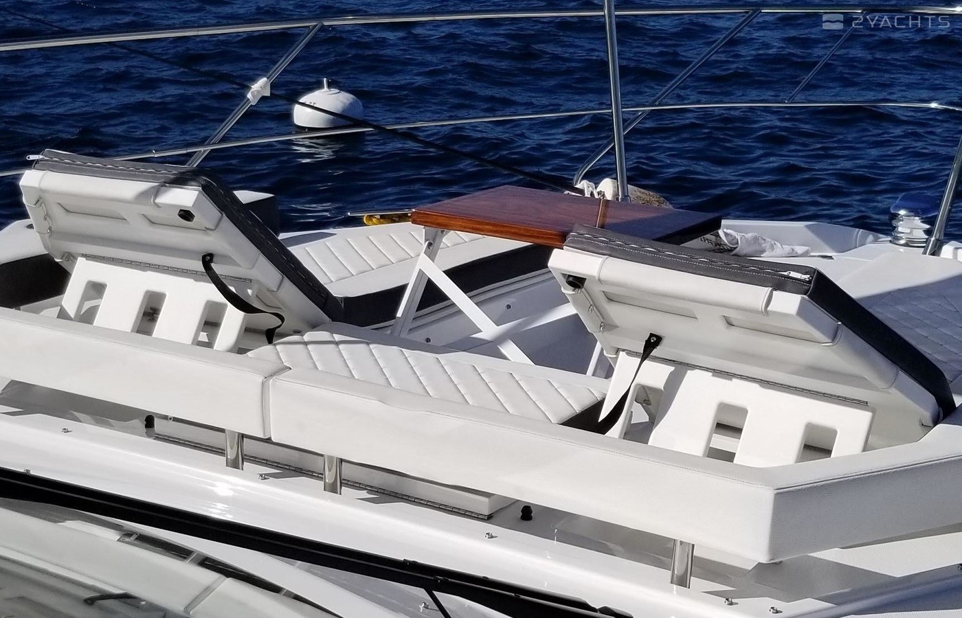 This Yacht is fully loaded and has been equiped and set up by a captain with 50 years experience and for extended stays at Catalina Island. A 50 foot prime mooring in front of descanso beach is optional. The yacht is equipped with a state of the art blue ocean water maker with auto flush. In addition an inverter with a huge battery bank powering all outlets TV monitors dvd players and appliances as a back up to the onan generator. The hull is the optional paint to sample Navy blue which blows away a white hull. It's the classic nautical color. The swim step has deployable ladders / stairs to provide easy access. The swim step was set up with stainless hold downs for the optional brand new 260 Nouvoraniawith a 40 hp fuel injected Honda. The yacht has a heavily upgraded fusion sound system through our including the tender. The yacht comes with the extended warranty through Volvo through 2024 which is transferrable. The yacht was just hauled and bottom painted as well as fully serviced including all warrant repairs discovered through servicing. The yacht has every conceivable option and upgrade including a seakeeper Stabilizer 7 that virtually eliminates roll. The yacht can be moored in rough seas and roll is totally eliminated. This Yacht lists for 2 million new and has 100s of thousands in options above that . The cockpit and stars are finished in teak flex which looks identical to teak without the maintenance.