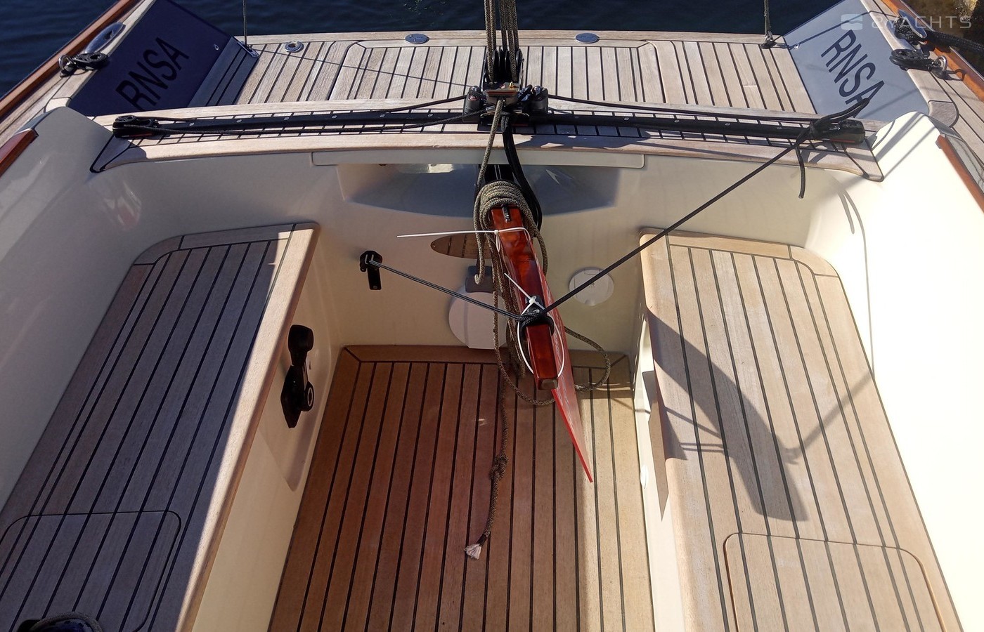 Teak decksTeak foot bar on foredeckLarge aft locker, flush lidFlush / lifting deck cleats, two bow, two sternBow rollerAnchor locker Bruce 5kg stainless steel anchor with chain and warpStainless steel bow protection stripVarnished toe rail with stainless steel protection strips at bow, midships and sternFull cover by Saturn Sails as in photographsVarious warps and fendersFixed keel with lead bulb