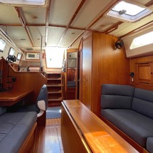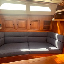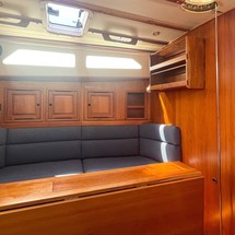 Ardea's below deck accommodations open up to a spacious main salon. There's a settee berth to either hull side, plush 5" cushions in blue canvas upholstery, each with lee cloths, a drop-leaf table with storage in the center section and convenient drawers below, lockers and bookshelves for additional outboard storage and overhead grab rails all within easy reach. The vessel's domestic tankage are located below these salon settees.